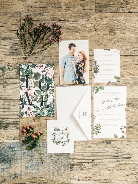 15. Partecipazioni con Foglie Fiori e Foto degli Sposi