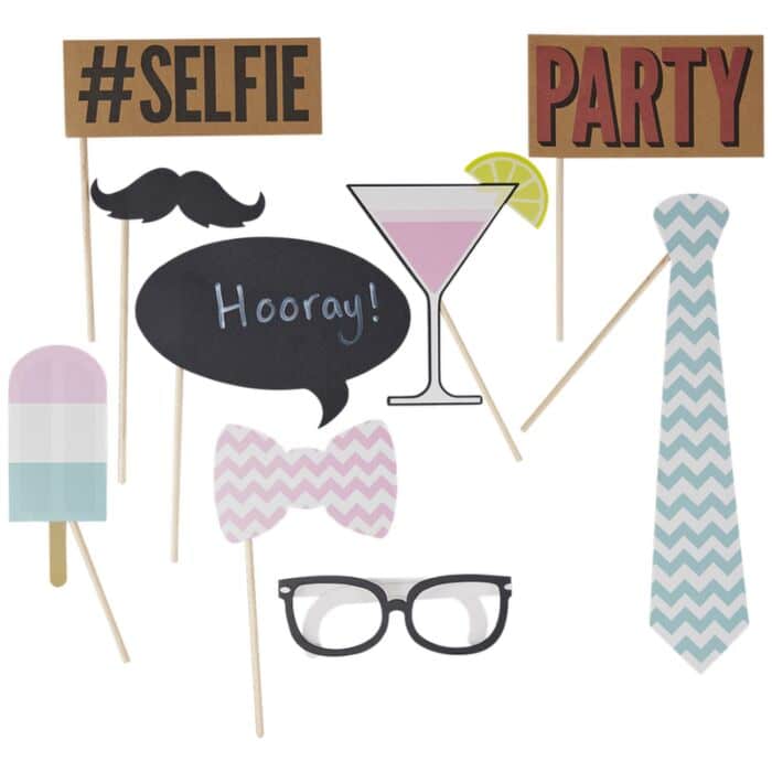 Ogni confezione include 10 props: 1 #SELFIE, 1 PARTY, 1 gelato, 1 calice da cocktail, 1 cravatta, 1 fifì, un paio di baffi, 1 nuvola fumetto lavagna, occhiali e occhiali da sole.