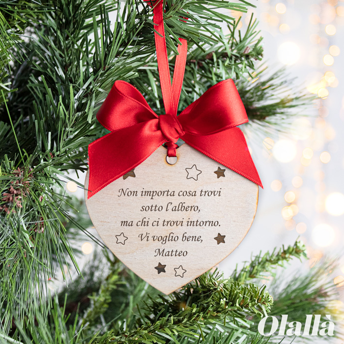 Decorazione in legno per albero di Natale a forma di cuore personalizzata con la vostra frase speciale. Pensato per ricordare i nostri cari che sono venuti a mancare, ma che sono sempre vicino a noi… specialmente a Natale.