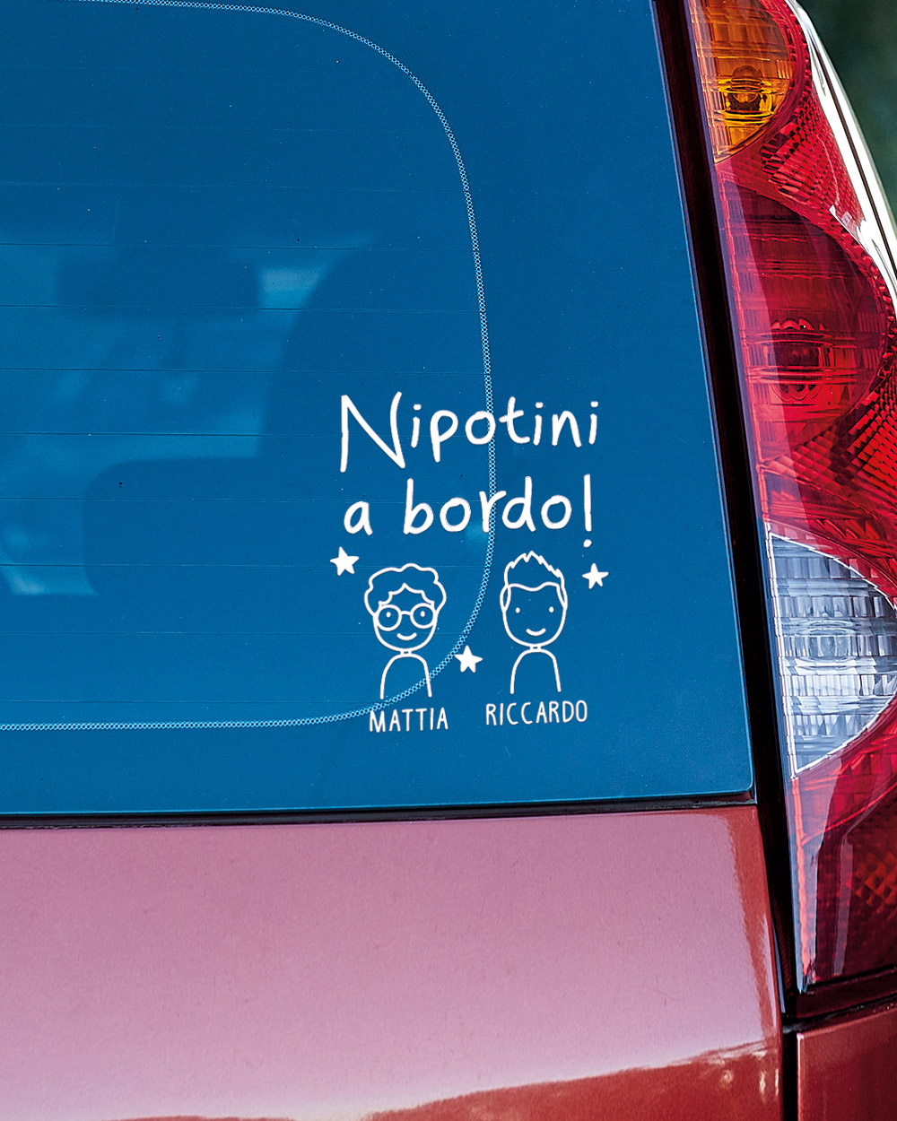 Adesivi per auto, adatti a essere incollati sulla carrozzeria o sui vetri. Personalizzabili fino a 8 personaggi.