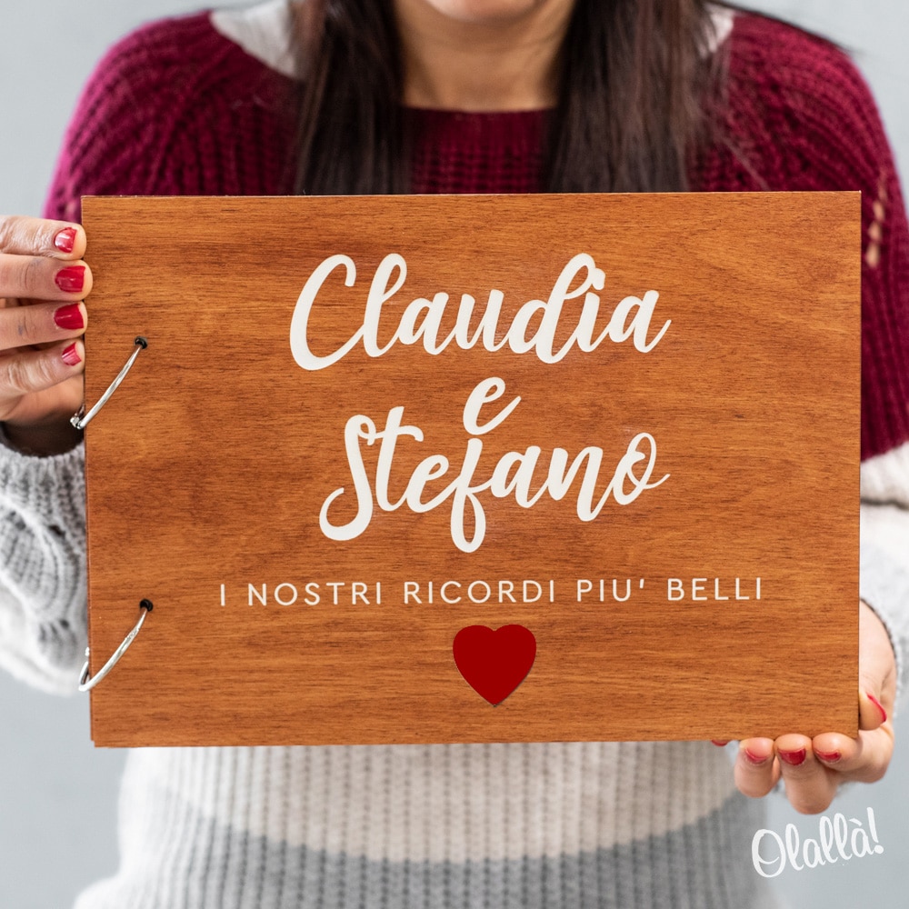 Emozionante album fotografico in legno personalizzato con i vostri nomi e la tua dedica, abbellito da un cuore inciso. Riempi questo album con tutte le vostre foto, i biglietti aerei e di concerti che avete collezionato negli anni… farai un regalo di San Valentino o anniversario che farà emozionare la tua dolce metà!