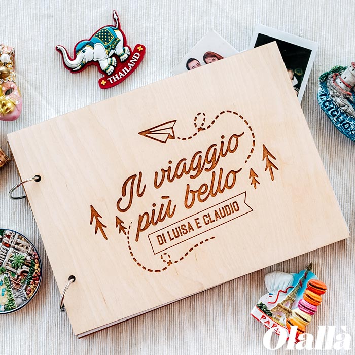 Album libro in legno con fogli bianchi rilegato con anelle e personalizzato con una incisione a tema viaggio. Personalizza frase e nomi come desideri e realizza il libro perfetto per i ricordi del tuo viaggio. Attacca con colla o washi tape biglietti di viaggio, polaroid, etichette….tutto ciò che ogni volta che lo riaprirai potrà subito farti reimmergere nel vostro viaggio più bello!