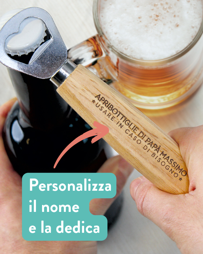 Un regalo diverso dal solito, pensato per tutti i papà che amano rilassarsi sorseggiando della buona birra. Regala al tuo papà questo apribottiglie personalizzato in occasione della Festa del Papà o del suo compleanno e stappate insieme una bottiglia!