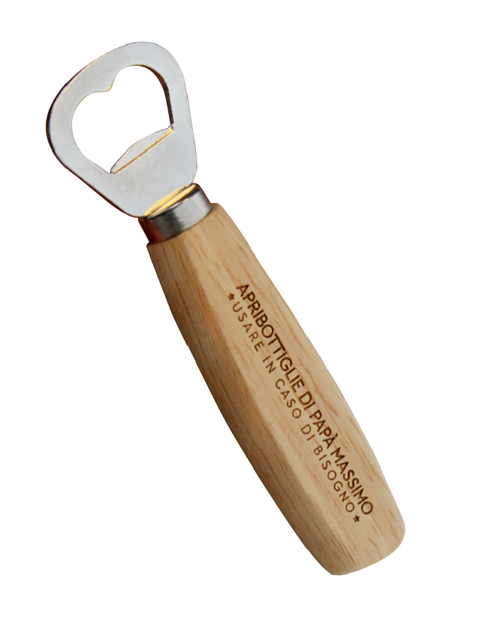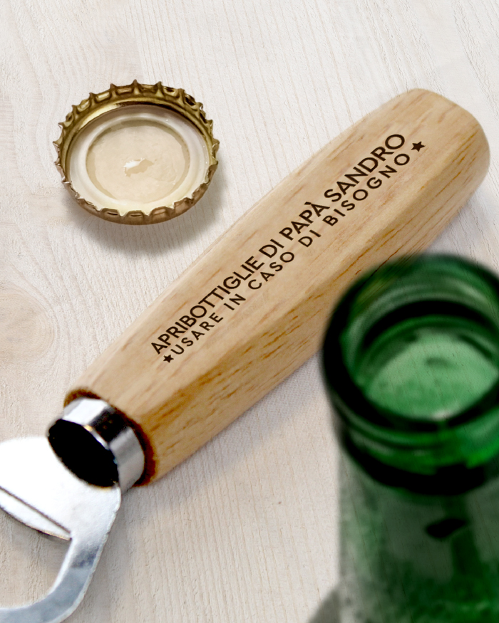 Apribottiglie con manico in legno inciso personalizzabile con nome e dedica.