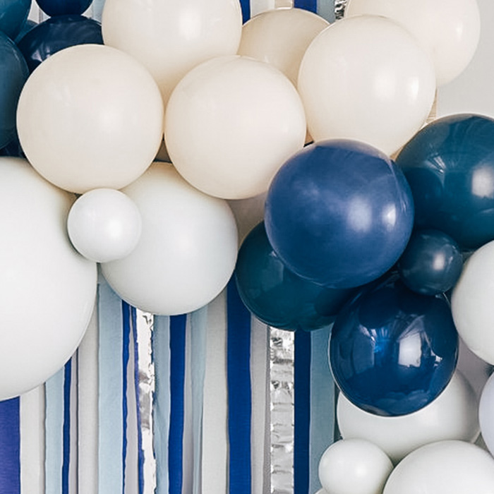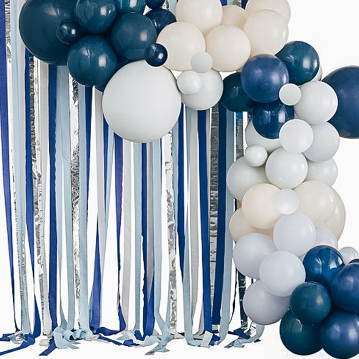 La scatola contiene 70 palloncini di varia grandezza nei colori blu navy, crema, blu polvere e grigi. Inoltre contiene 300 metri di carta crespa colorata in nastro, in vari colori: azzurro pastello, blu scuro, bianco e argento.