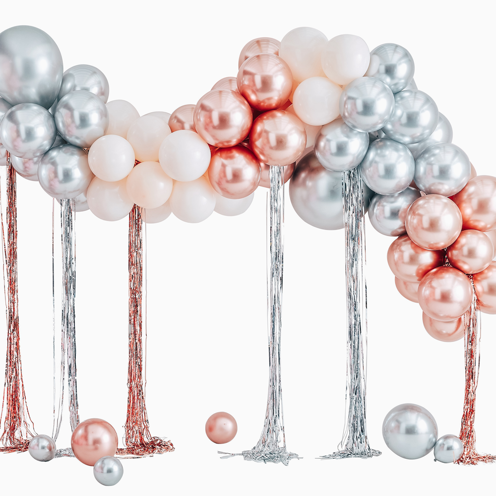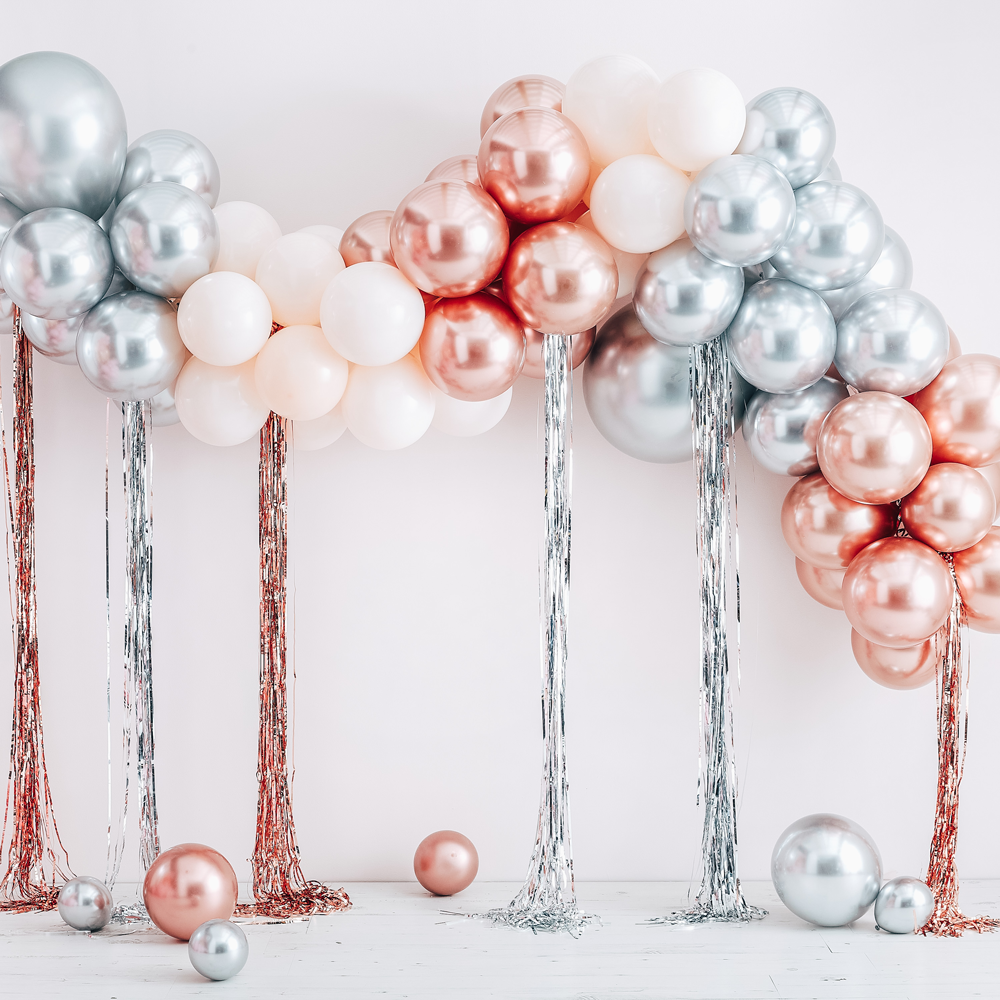 Imponente Arco di Palloncini Metallizzati con Festoni Scintillanti. Questa decorazione è l’ideale per le tue feste e i tuoi eventi di compleanno, nascita o baby shower!