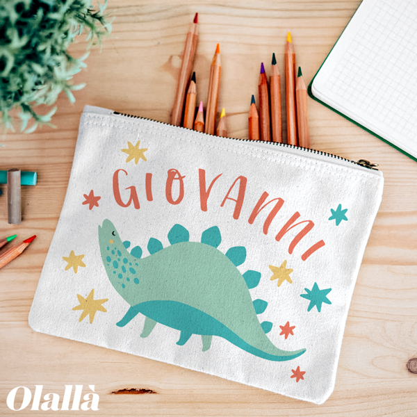 Astuccio bustina personalizzato con un simpatico dinosauro ed il nome del tuo bambino. Ideale per contenere tutti i piccoli oggetti che servono al tuo bambino a scuola, dalla mascherina al gel disinfettante per le mani, è pensata anche per matite, tovagliette e bavaglini!
