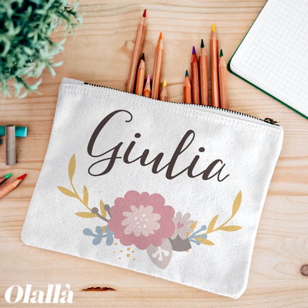 Astuccio bustina personalizzato con un decoro fiorito ed il nome del tuo bambino. Ideale per contenere tutti i piccoli oggetti che servono al tuo bambino a scuola, dalla mascherina al gel disinfettante per le mani, è pensata anche per matite, tovagliette e bavaglini!