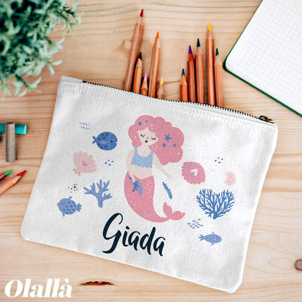 Astuccio bustina personalizzato con un decoro marino con sirenetta ed il nome del tuo bambino. Ideale per contenere tutti i piccoli oggetti che servono al tuo bambino a scuola, dalla mascherina al gel disinfettante per le mani, è pensata anche per matite, tovagliette e bavaglini!