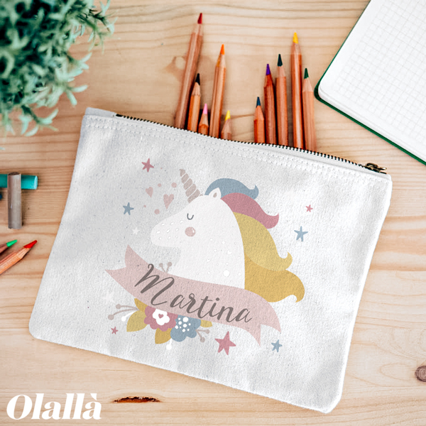 Astuccio bustina personalizzato con un dolce Unicorno ed il nome del tuo bambino. Ideale per contenere tutti i piccoli oggetti che servono al tuo bambino a scuola, dalla mascherina al gel disinfettante per le mani, è pensata anche per matite, tovagliette e bavaglini!