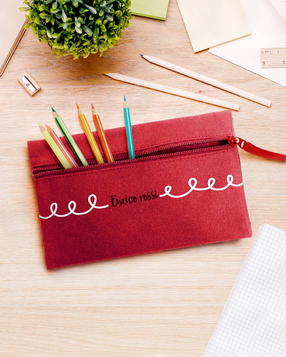 Astuccio portapenne o bustina porta tutto personalizzato con nome e la frase che desideri con un simpatico decoro giallo e arancione. Ideale per matite, penne e pennarelli, data la capienza è pensato anche per contenere tutti i piccoli oggetti che servono al tuo bambino a scuola.