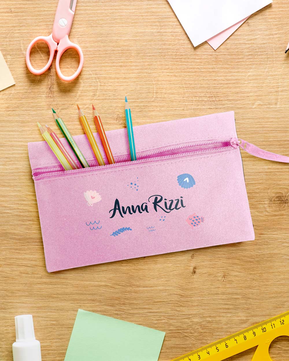 Astuccio portapenne o bustina porta tutto con disegno di sirena e nome, anche personalizzabile con dedica sul retro. Ideale per matite, penne e pennarelli, data la capienza è pensato anche per contenere tutti i piccoli oggetti che servono al tuo bambino a scuola.