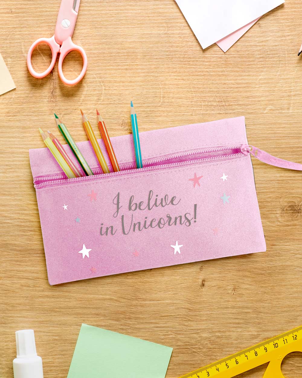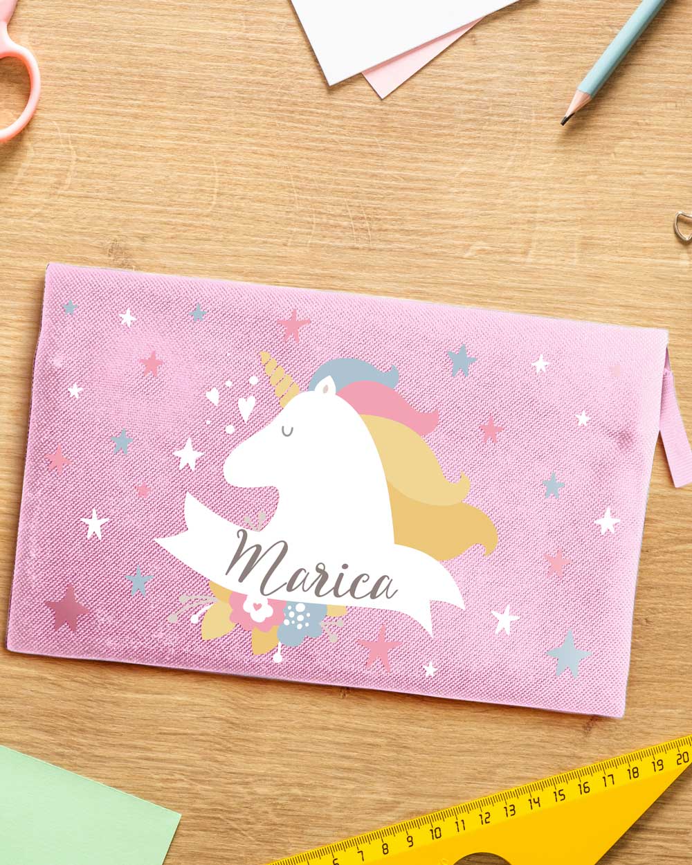 Astuccio portapenne o bustina porta tutto con un unicorno e banner con il nome, anche personalizzabile con dedica sul retro. Ideale per matite, penne e pennarelli, data la capienza è pensato anche per contenere tutti i piccoli oggetti che servono al tuo bambino a scuola.