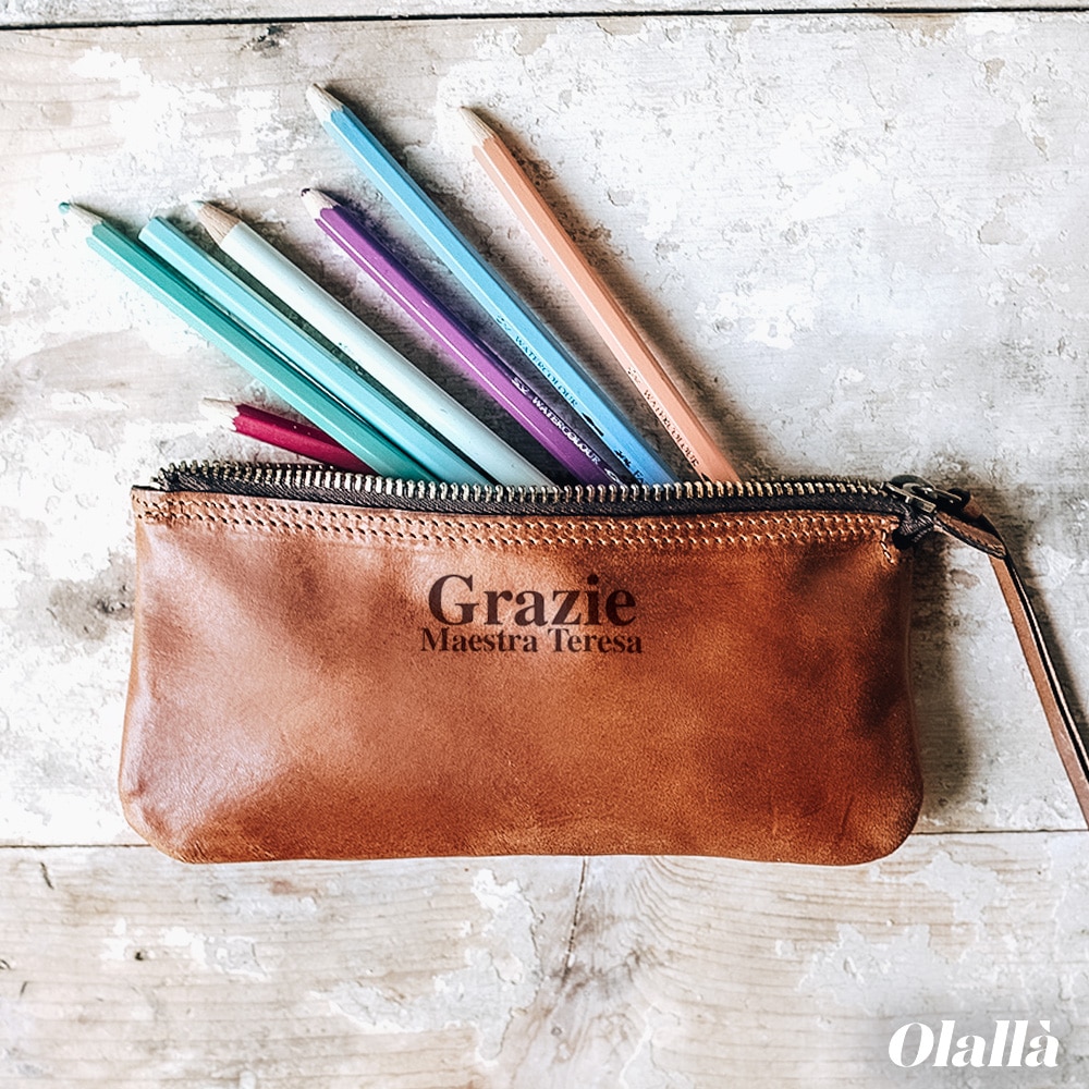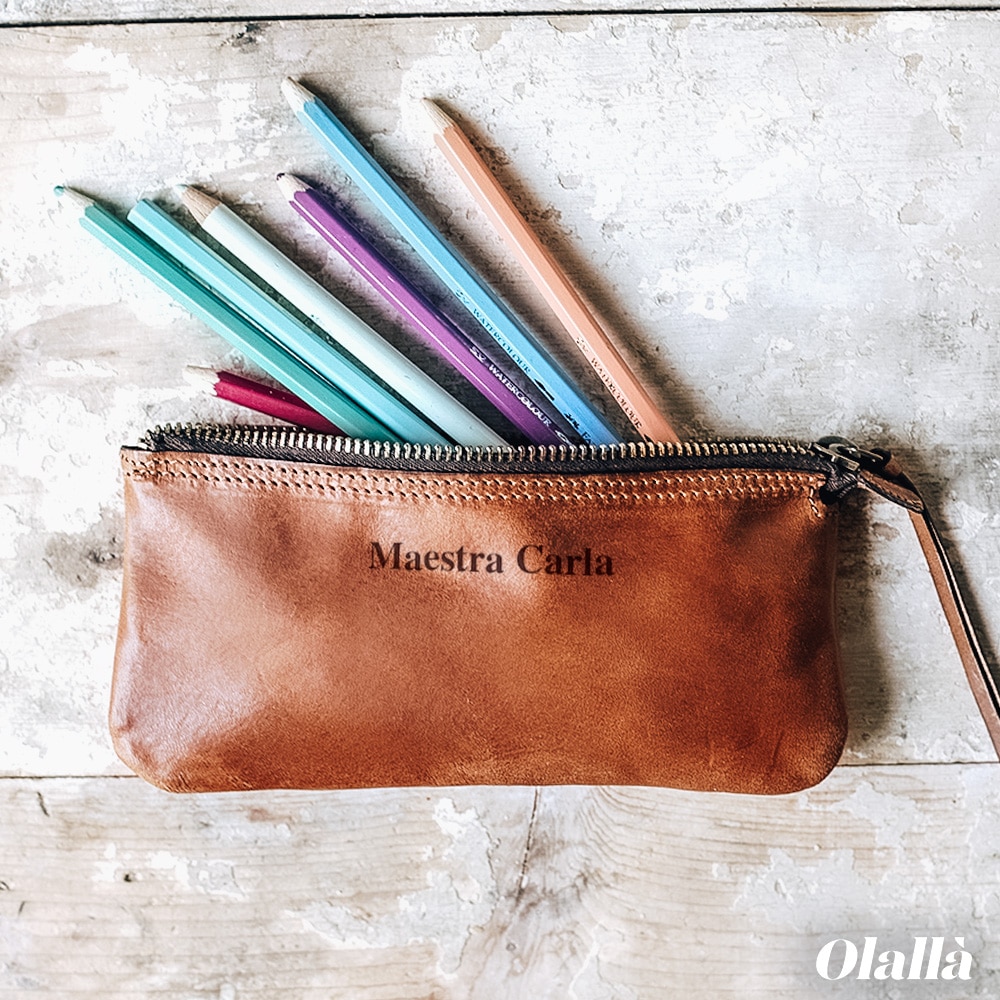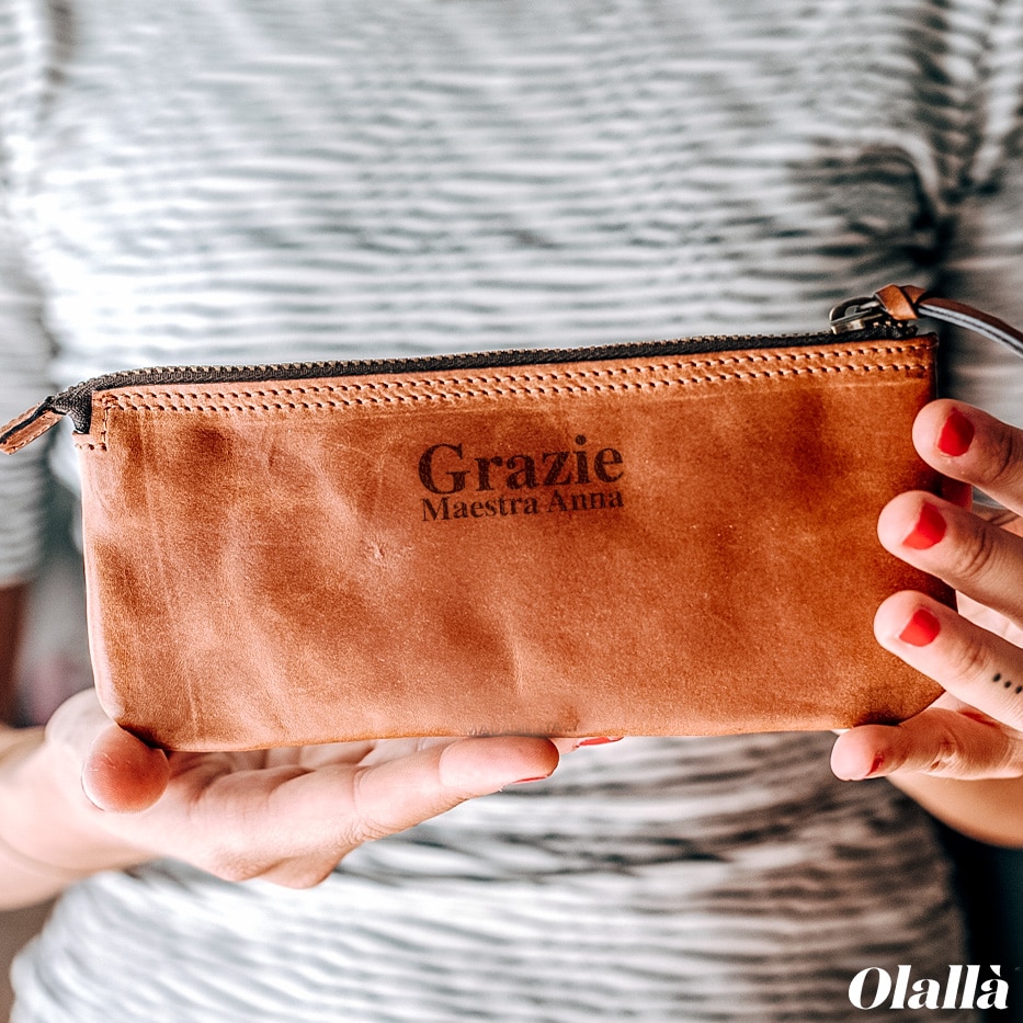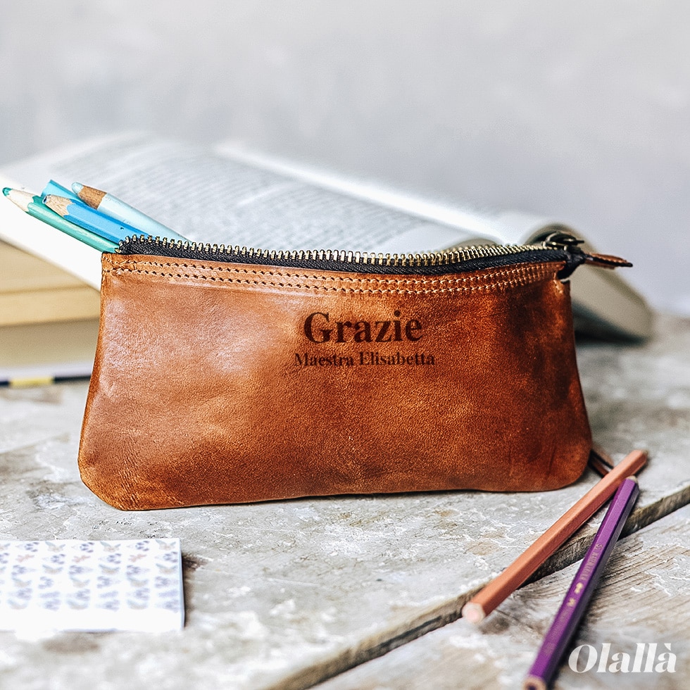 Astuccio portapenne made in Italy realizzato artigianalmente con pelle italiana. Chiusura con zip in metallo color bronzo. Personalizzabile con la tua frase incisa in maniera indelebile.