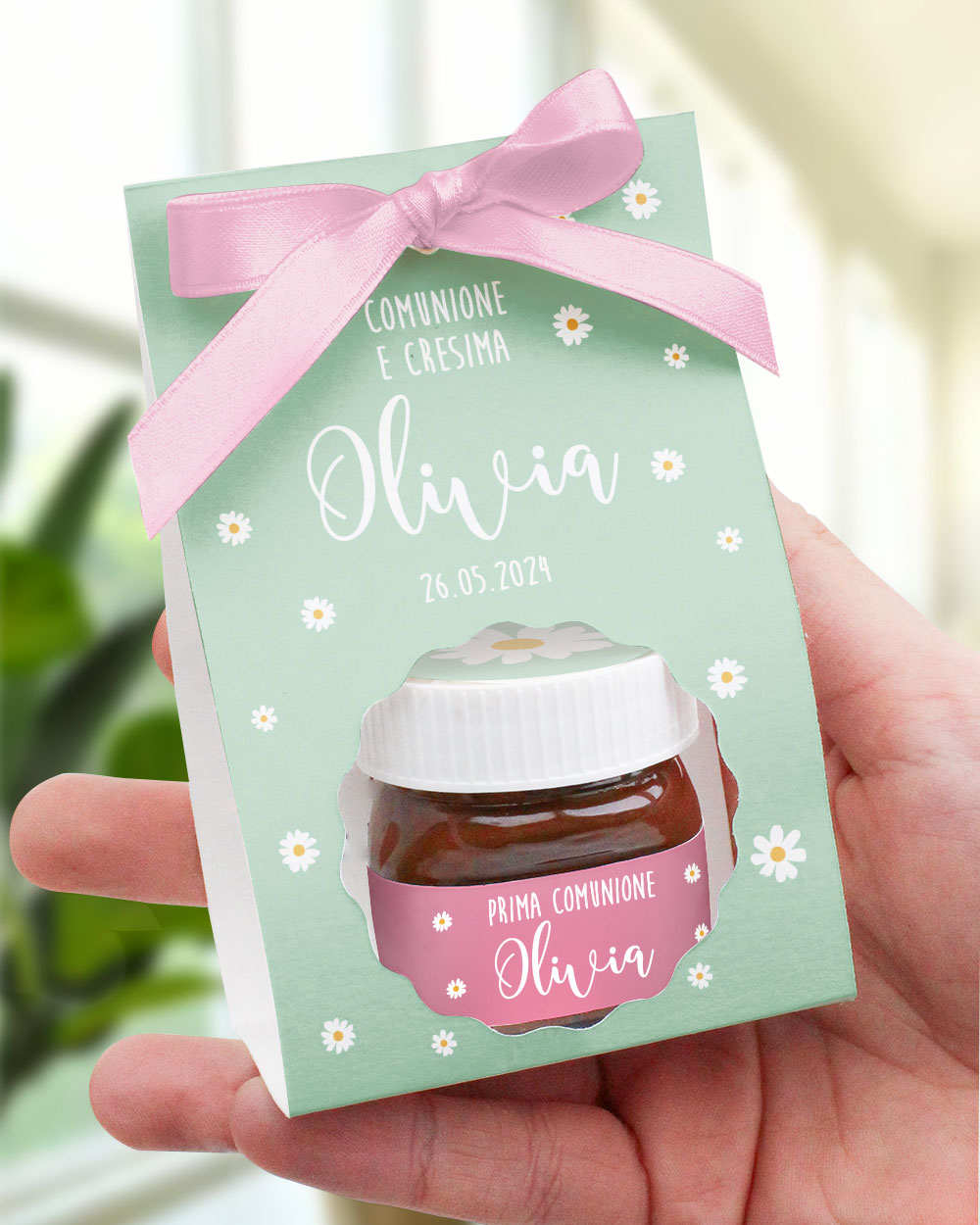 Quando si tratta di celebrare un evento speciale come il Battesimo, la Prima Comunione o la Cresima di una bambina, ogni dettaglio conta. Il nostro barattolino di Mini Nutella da 25 gr, con etichetta rosa e cartoncino verde pastello a tema floreale, è l’idea bomboniera perfetta per rendere questo giorno indimenticabile e lasciare un ricordo di indimenticabile dolcezza.