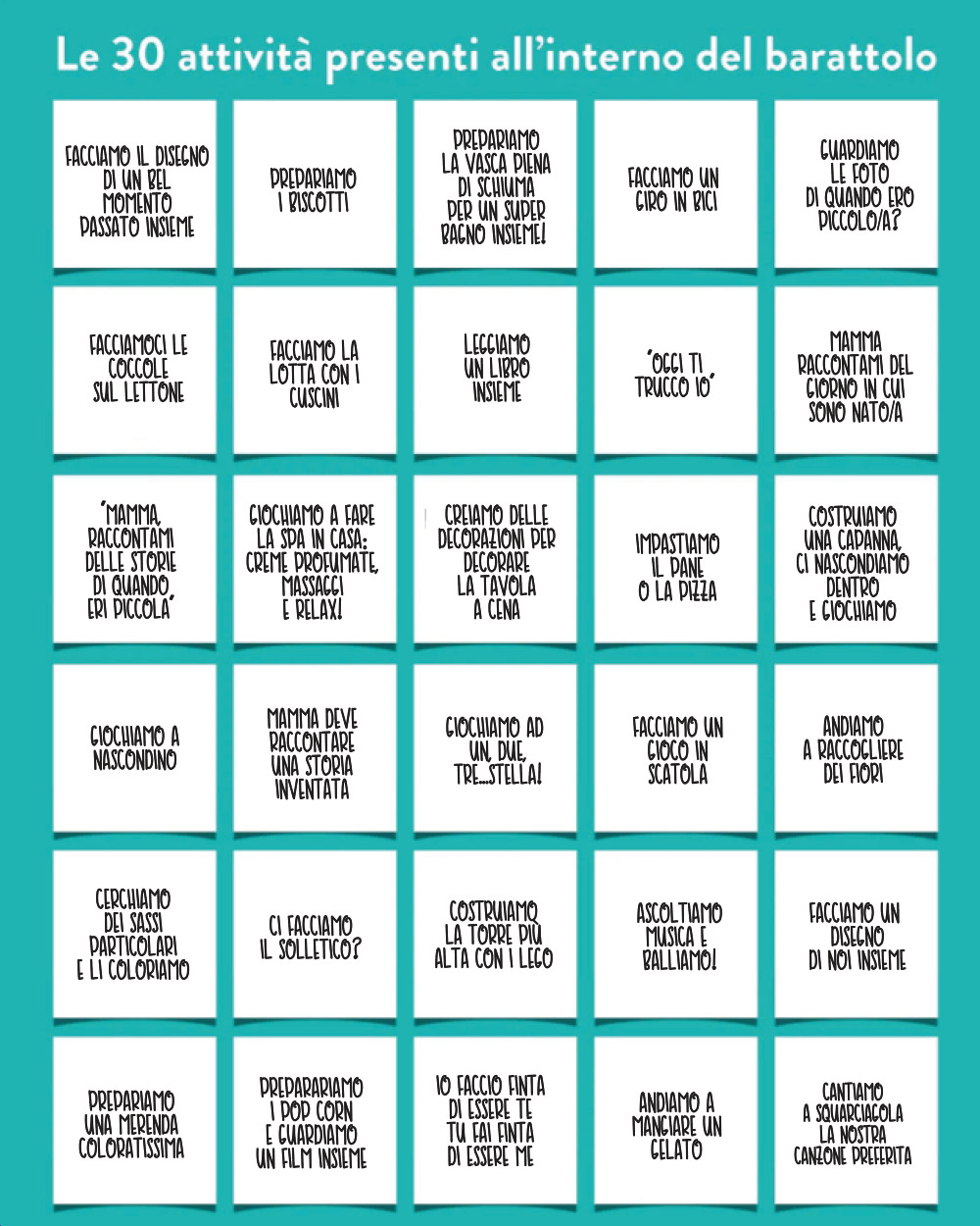 Il barattolo contiene 30 bigliettini di cartoncino colorato precompilati con attività da fare insieme. Tutti i bigliettini vengono inseriti all’interno del barattolo insieme agli adesivi gratta-e-vinci che vanno incollati in autonomia sui bigliettini (non sono già incollati).