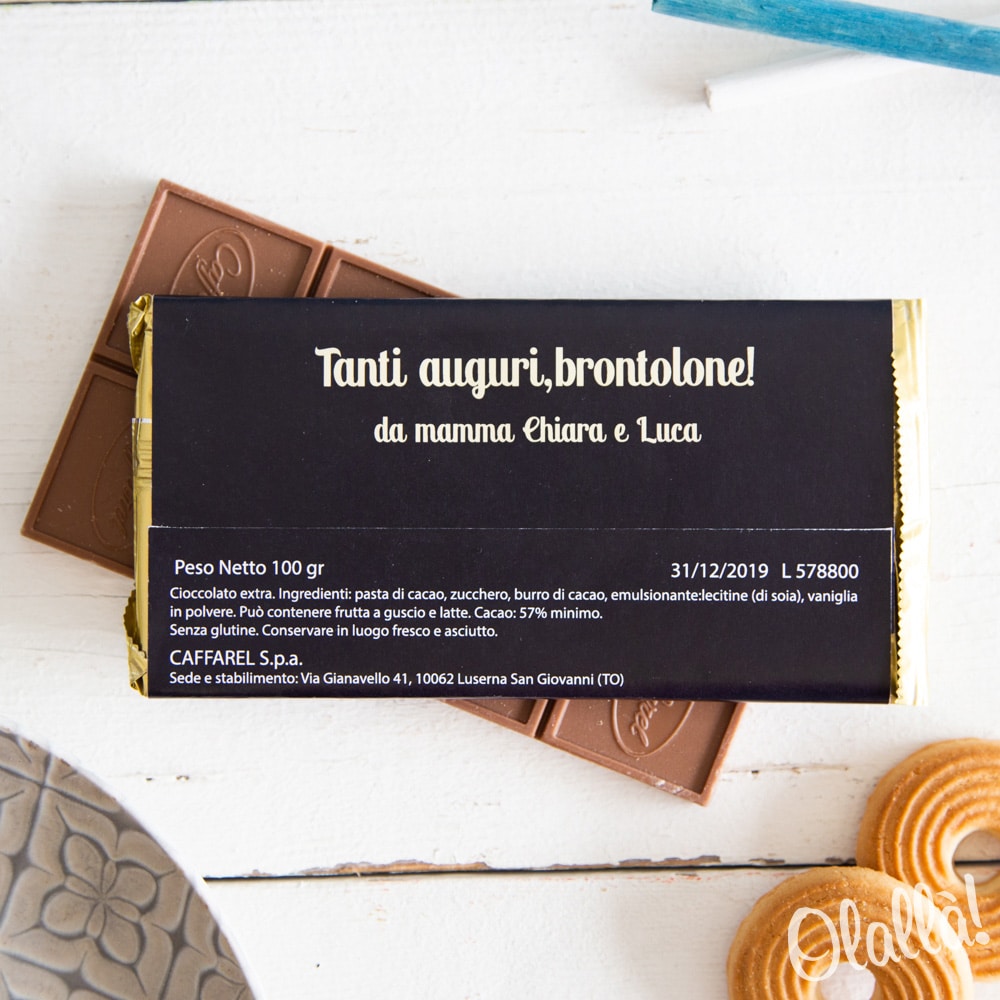 CIOCCOLATO PERSONALIZZATO Barretta di cioccolato 100g artigianale realizzato da una cioccolateria del territorio, disponibile al latte o fondente, a scelta. Potrebbe contenere tracce di glutine e di latte.