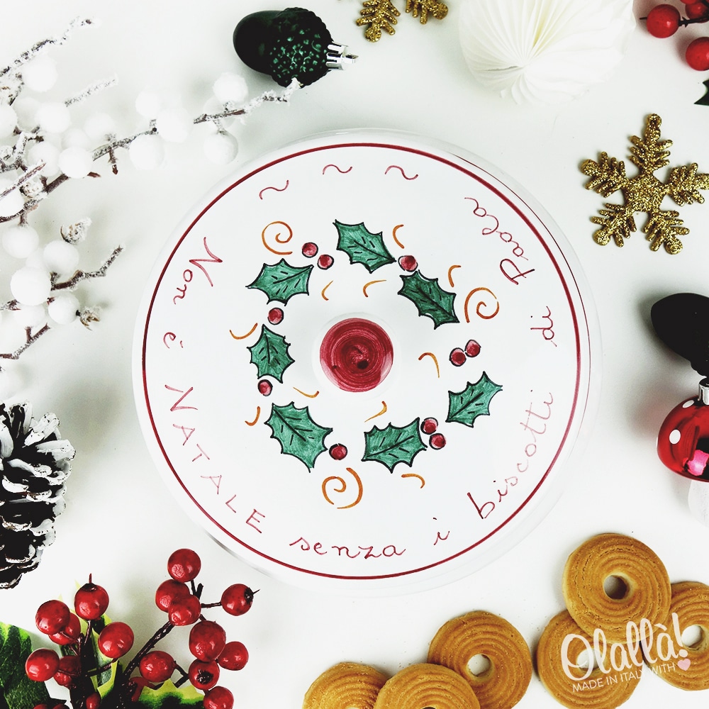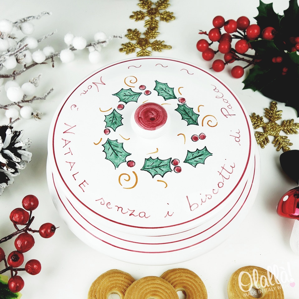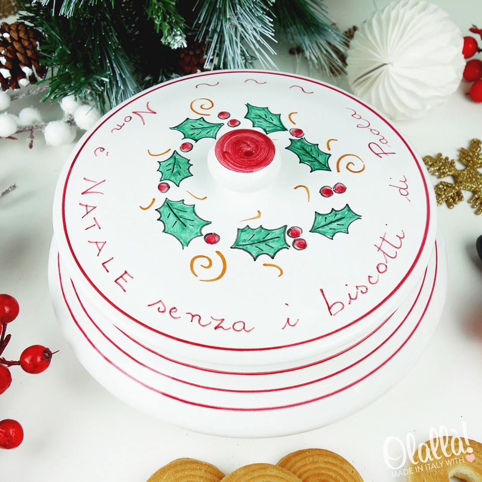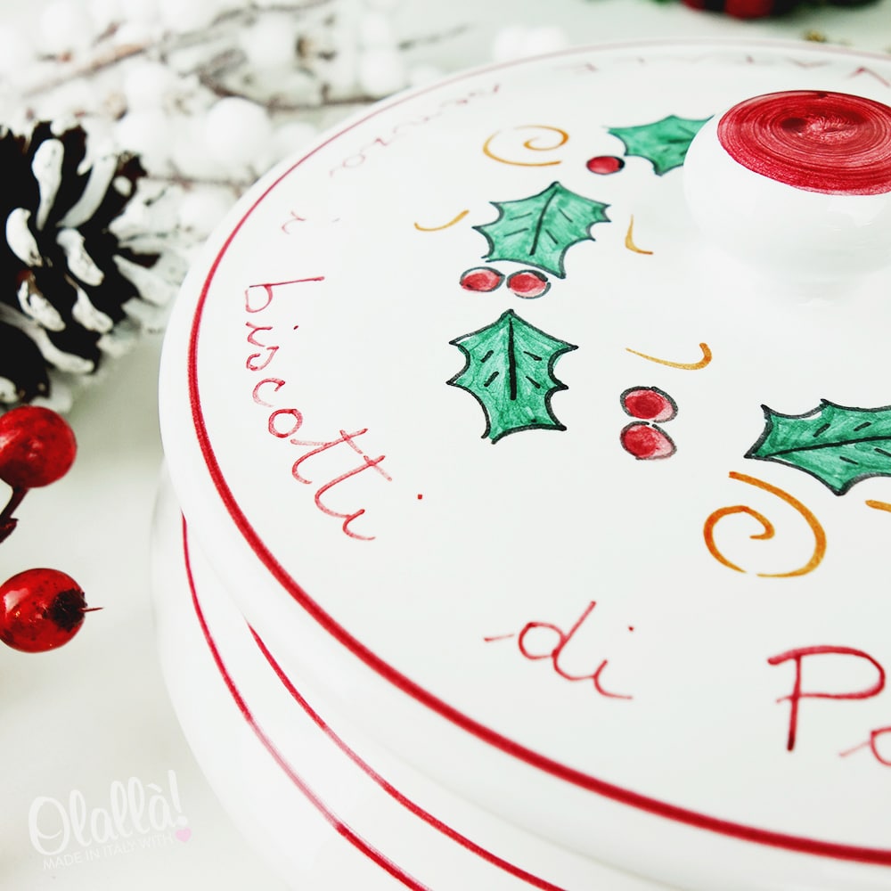 Biscottiera in ceramica con decorazione natalizia dipinta a mano, unica e originale, perfetta come regalo di Natale da trovare sotto l’albero. Personalizzabile nella parte superiore con una frase a vostra scelta e sotto il coperchio con la dedica.