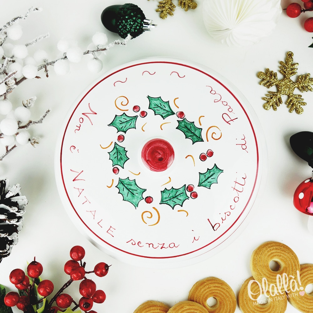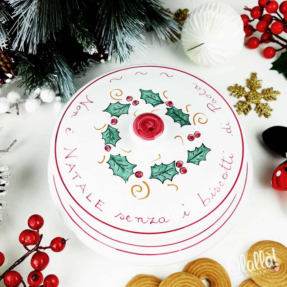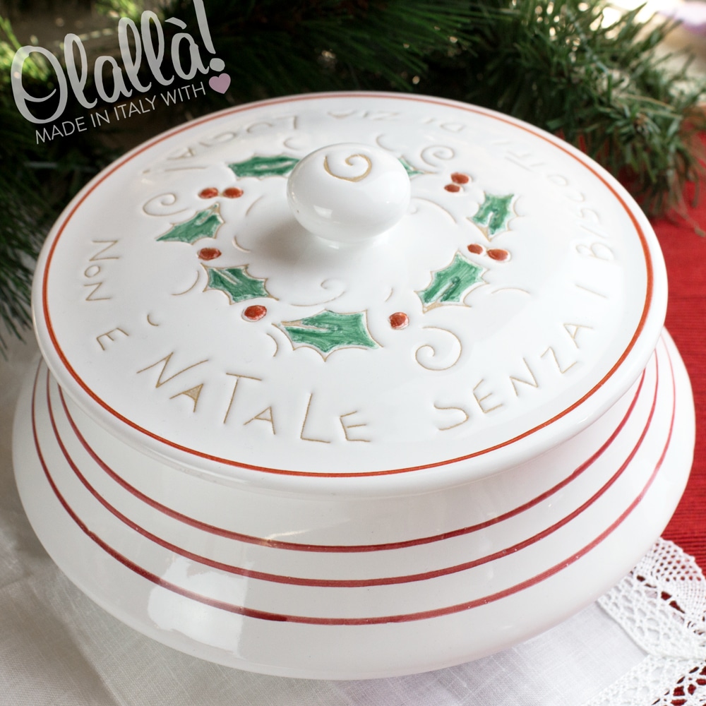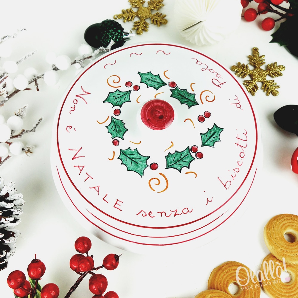 Biscottiera in ceramica con decorazione natalizia dipinta a mano, unica e originale, perfetta come regalo di Natale da trovare sotto l’albero. Personalizzabile nella parte superiore con una frase a vostra scelta e sotto il coperchio con la dedica.