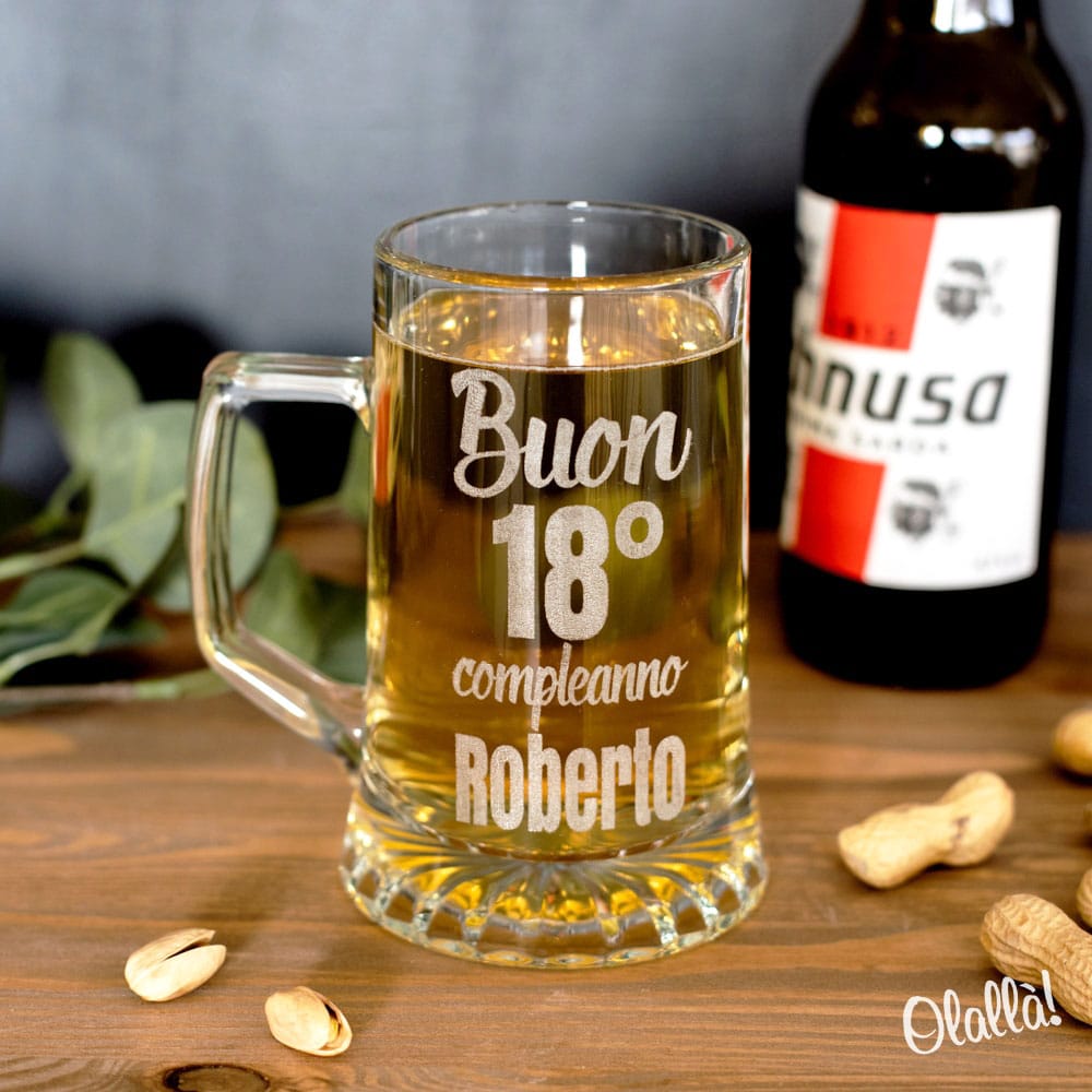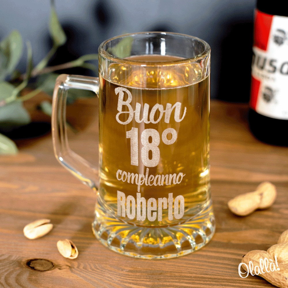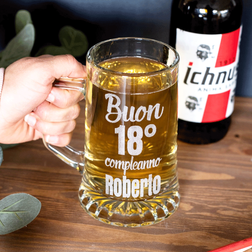 Prestigiosi bicchieri da birra con manico in vetro incisi con motivo o dedica personalizzata. 100% Alta Qualità Made in Italy.