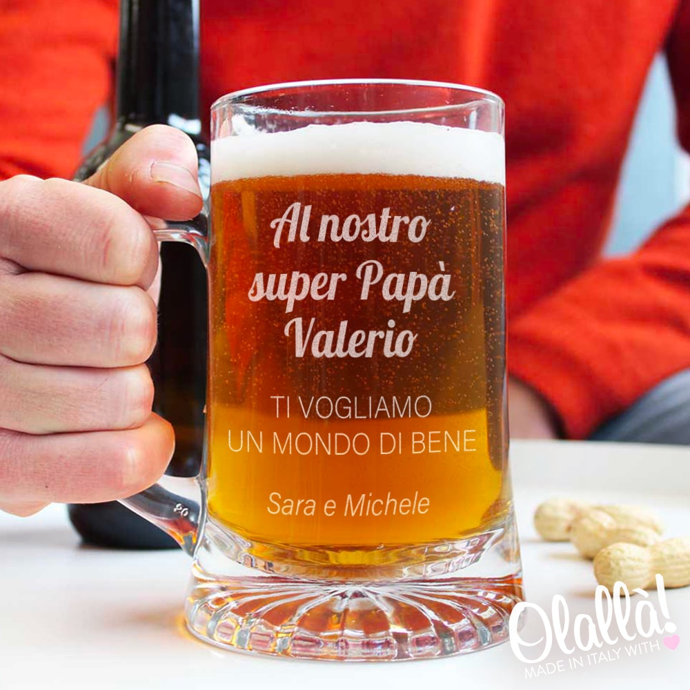 Boccale da birra personalizzato con la tua dedica speciale per il papà. Questo è un modo originale per fare gli auguri all’uomo più importante della tua vita nel giorno del suo compleanno o per la festa del papà… questo diventerà senza dubbio il suo boccale da birra preferito!