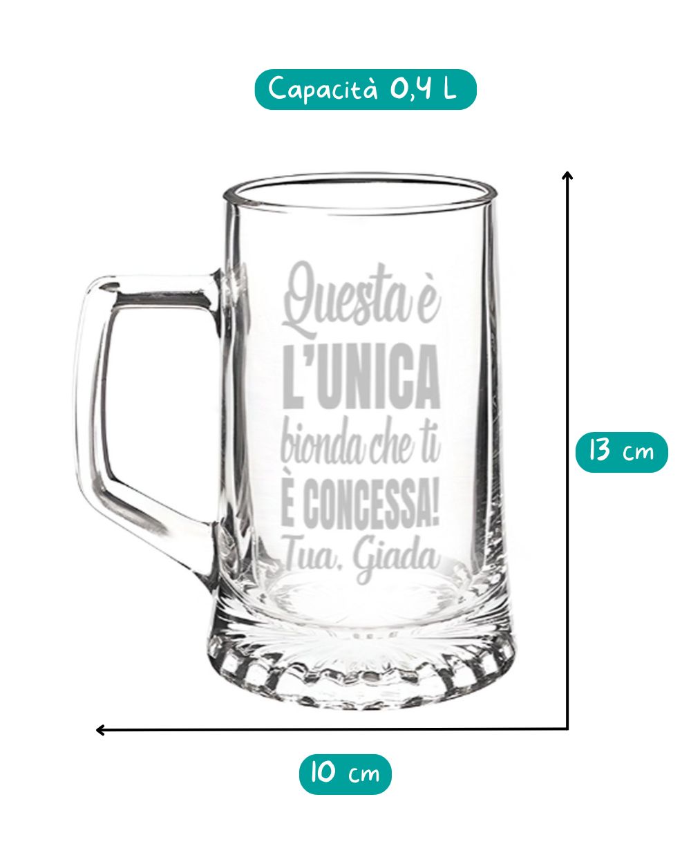 Scegli la versione che più ti rispecchia della frase “Questa è l’unica bionda/rossa che ti è concessa!” da incidere sul fronte del boccale di birra e, se lo desideri, aggiungi una dedica anche sul retro. Inoltre, puoi scegliere di completare il tuo regalo inserendo una birra artigianale italiana di alta qualità, personalizzata con un’etichetta che riporta la stessa scritta del boccale.