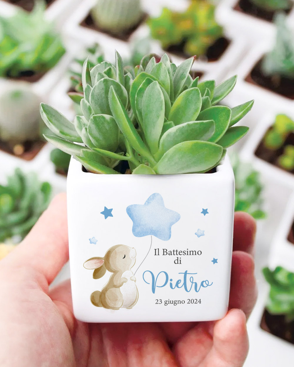 Bomboniera con Piante Grasse Succulente e Mini Cactus in Vasetto di Ceramica Bianco con Coniglietto Azzurro, Personalizzabile con Nome e Data – Idea Bomboniera Battesimo Bambino