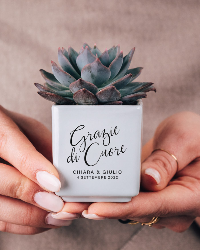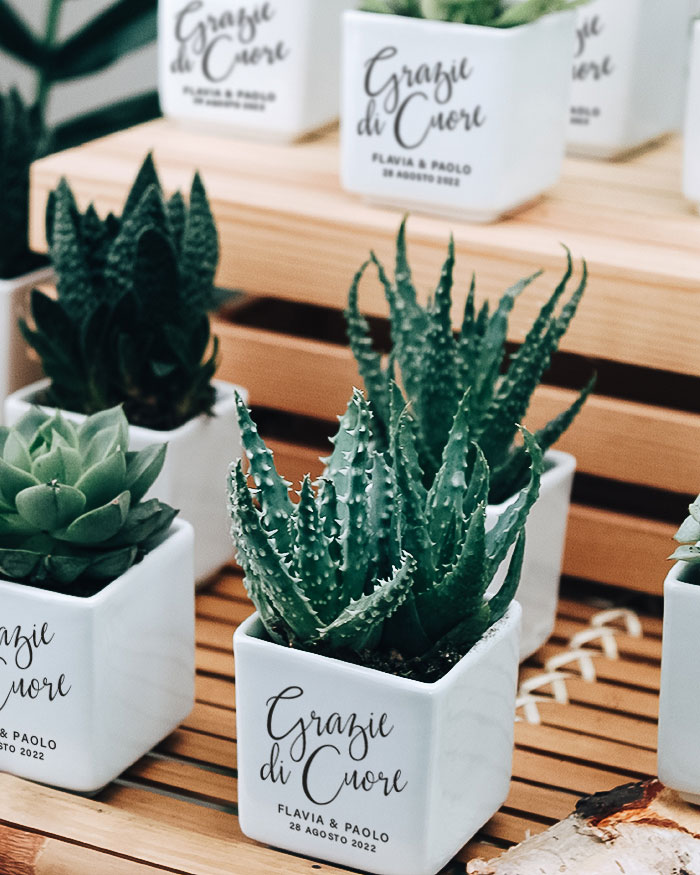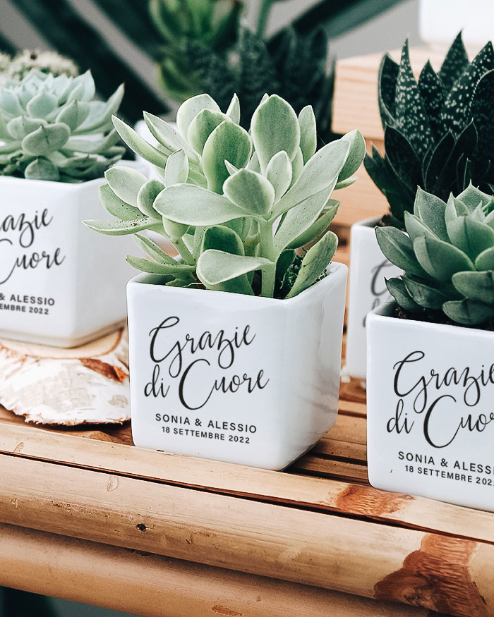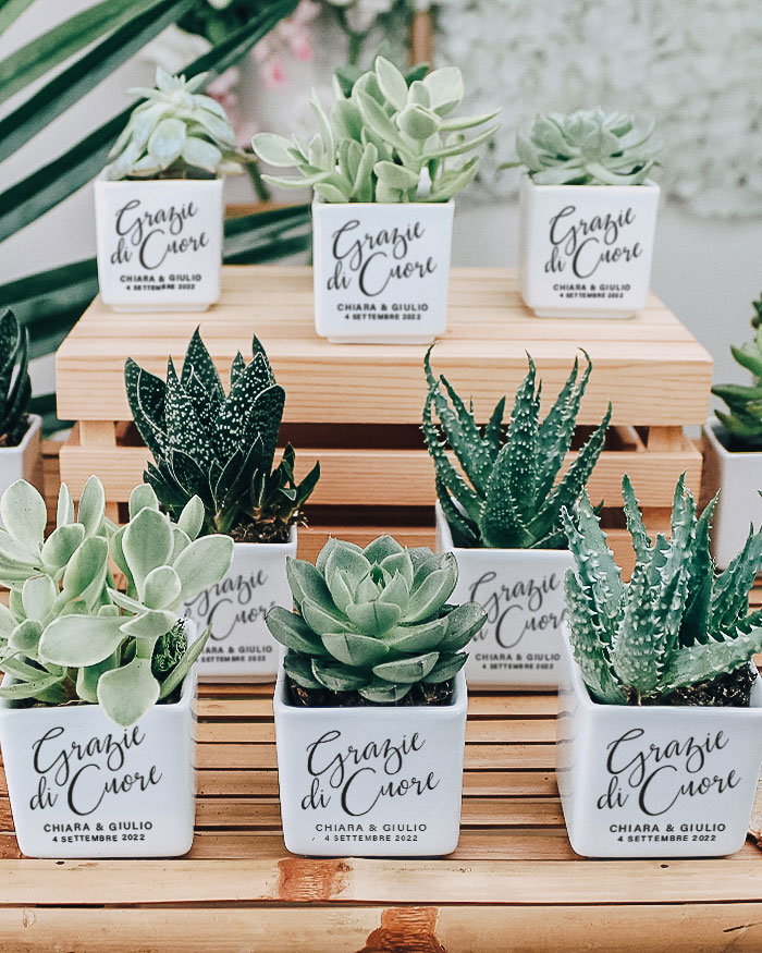 Bellissima Bomboniera con Piante Grasse Succulente e Mini-Cactus in vasetti di ceramica bianco. Li puoi personalizzare con i nomi degli sposi, la data del grande giorno e la dedica principale. Queste piantine grasse sono anche un’idea originale per dei segnaposto da utilizzare il giorno del matrimonio, che diventano così anche una bomboniera da portare a casa: approfitta di questo duplice utilizzo! Crea queste deliziose bomboniere per i tuoi eventi e aggiungi un tocco green alla cerimonia!
