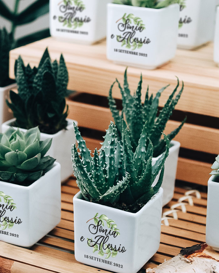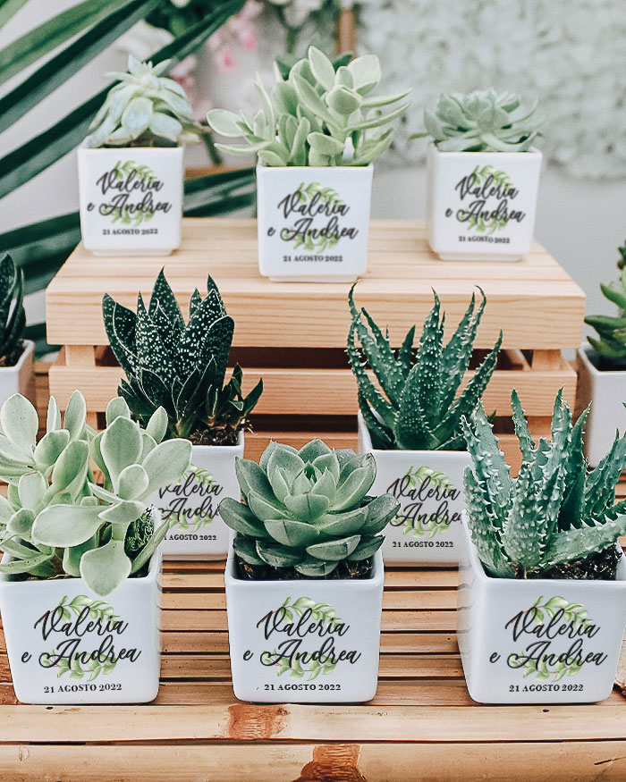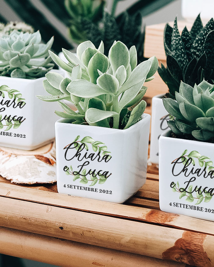 Bellissima Bomboniera con Piante Grasse Succulente e Mini-Cactus in vasetti di ceramica bianco. Li puoi personalizzare con i nomi degli sposi e la data del grande giorno. Queste piantine grasse sono anche un’idea originale per dei segnaposto da utilizzare il giorno del matrimonio, che diventano così anche una bomboniera da portare a casa: approfitta di questo duplice utilizzo! Crea queste deliziose bomboniere per i tuoi eventi e aggiungi un tocco green alla cerimonia!