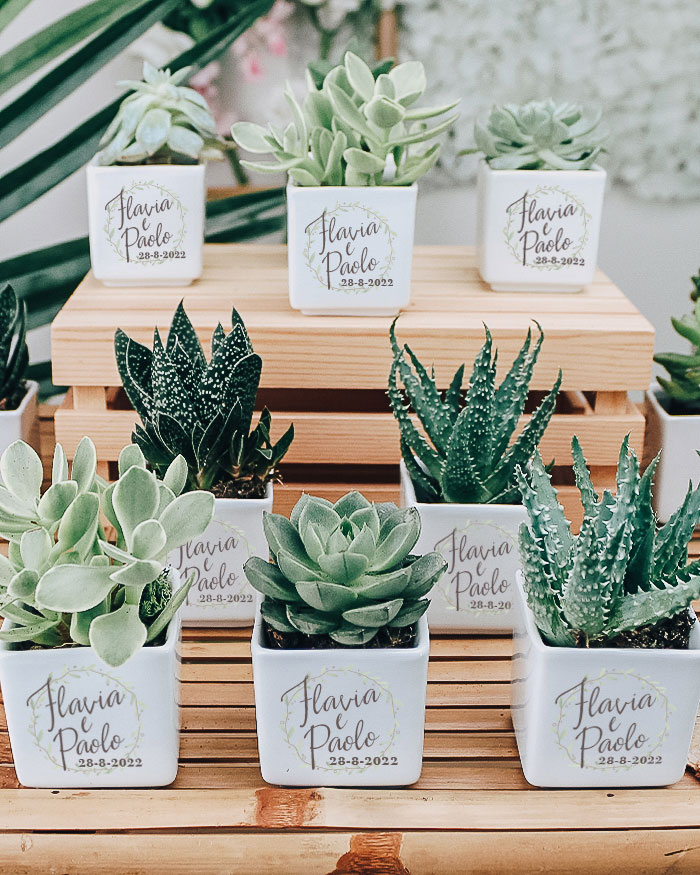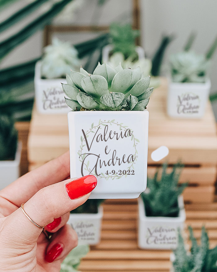Bellissima Bomboniera con Piante Grasse Succulente e Mini-Cactus in vasetti di ceramica bianco. Li puoi personalizzare con i nomi degli sposi e la data del grande giorno. Queste piantine grasse sono anche un’idea originale per dei segnaposto da utilizzare il giorno del matrimonio, che diventano così anche una bomboniera da portare a casa: approfitta di questo duplice utilizzo! Crea queste deliziose bomboniere per i tuoi eventi e aggiungi un tocco green alla cerimonia!