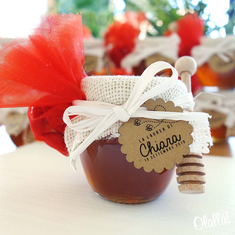 Dolcissimi vasetti di miele personalizzati in stile country. Copri vasetto in juta avorio, tag in carta kraft personalizzato con intestazione e data e nastro in rafia. Perfetti in occasione di una laurea, ma anche per un matrimonio, un anniversario importante, un battesimo o una comunione.