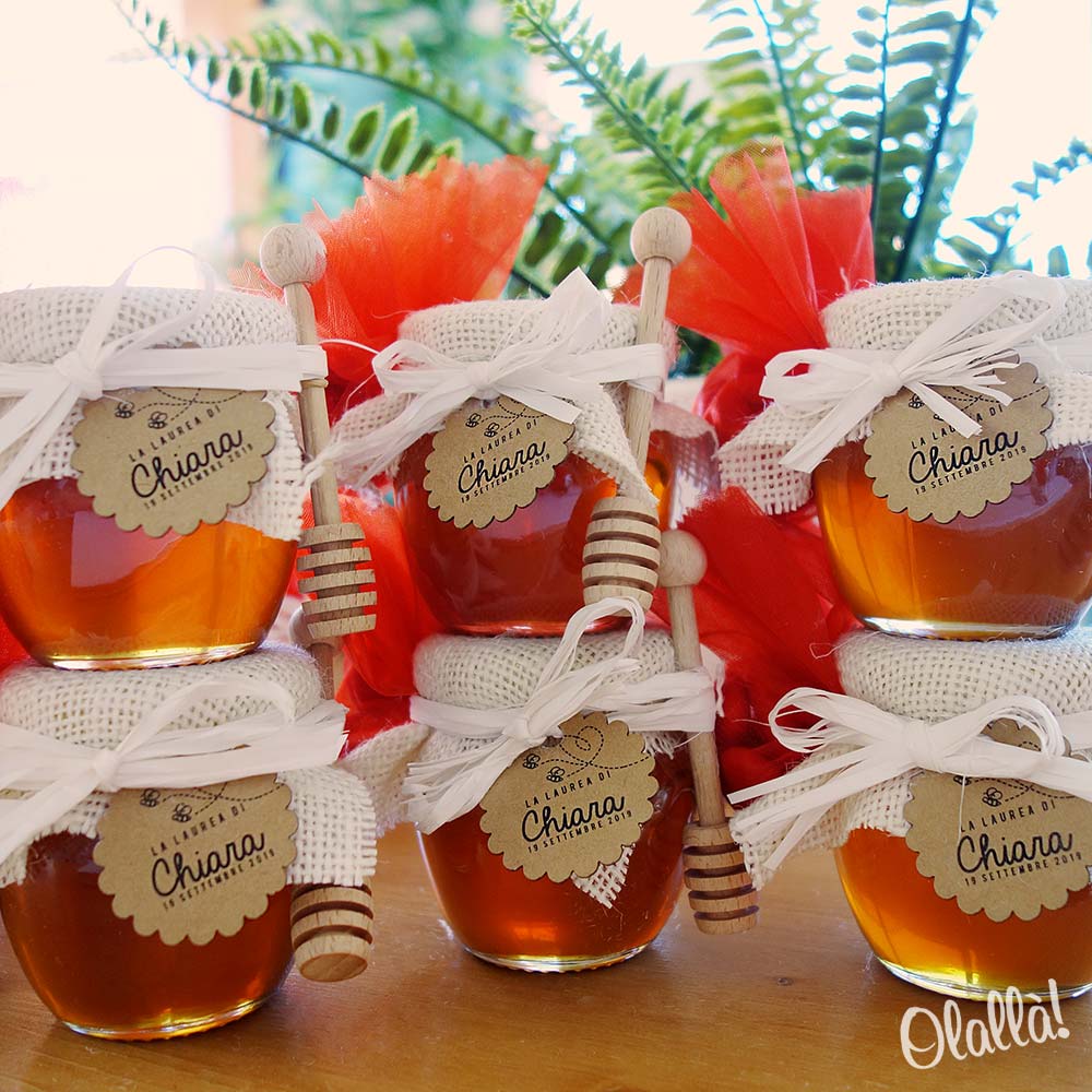 Dolcissimi vasetti di miele personalizzati in stile country. Copri vasetto in juta avorio, tag in carta kraft personalizzato con intestazione e data e nastro in rafia. Perfetti in occasione di una laurea, ma anche per un matrimonio, un anniversario importante, un battesimo o una comunione.