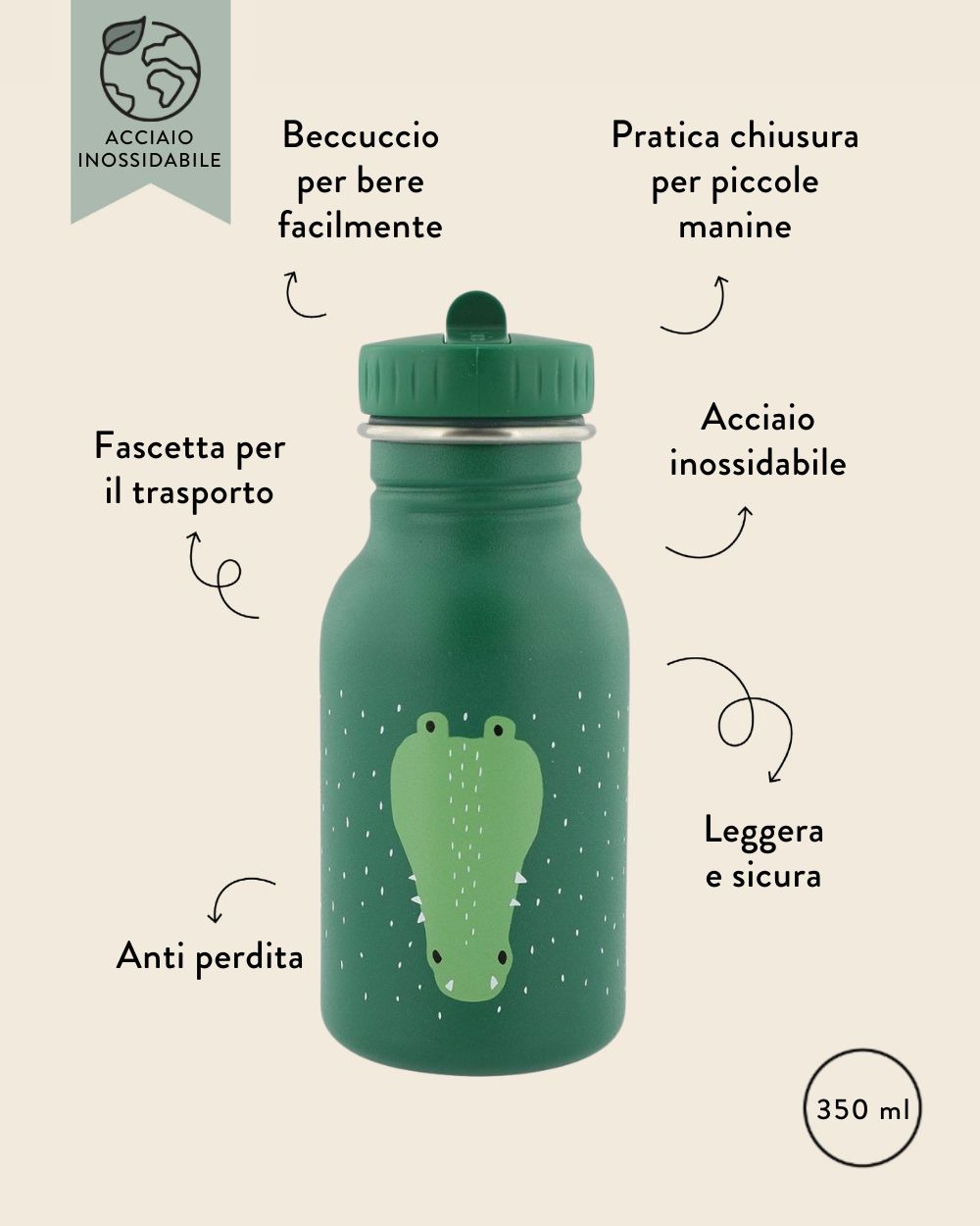 - Design con Mr Crocodile: Il simpatico coccodrillo decorativo aiuta i bambini a riconoscere facilmente la loro borraccia, rendendola un oggetto personale e unico.