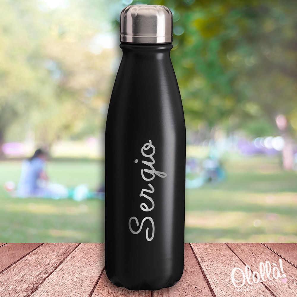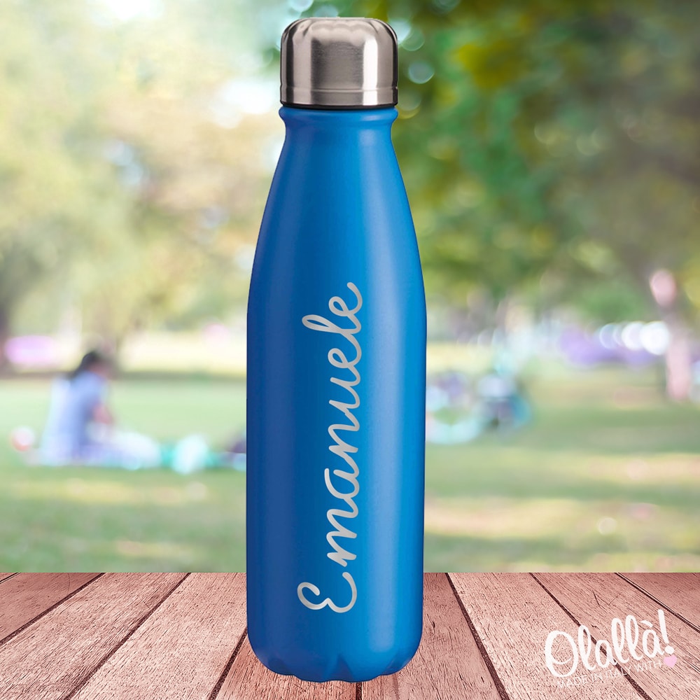 Ottima borraccia per sport e attività all’aperto in alluminio con tappo in acciaio. Personalizzala con un nome in uno splendido carattere corsivo e crea la tua borraccia unica ed originale. Adatta per bambini e ragazzi, sportivi e sportive. Colori a scelta.