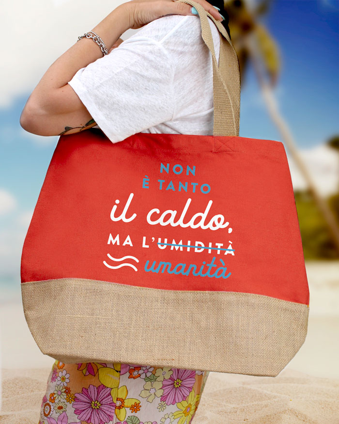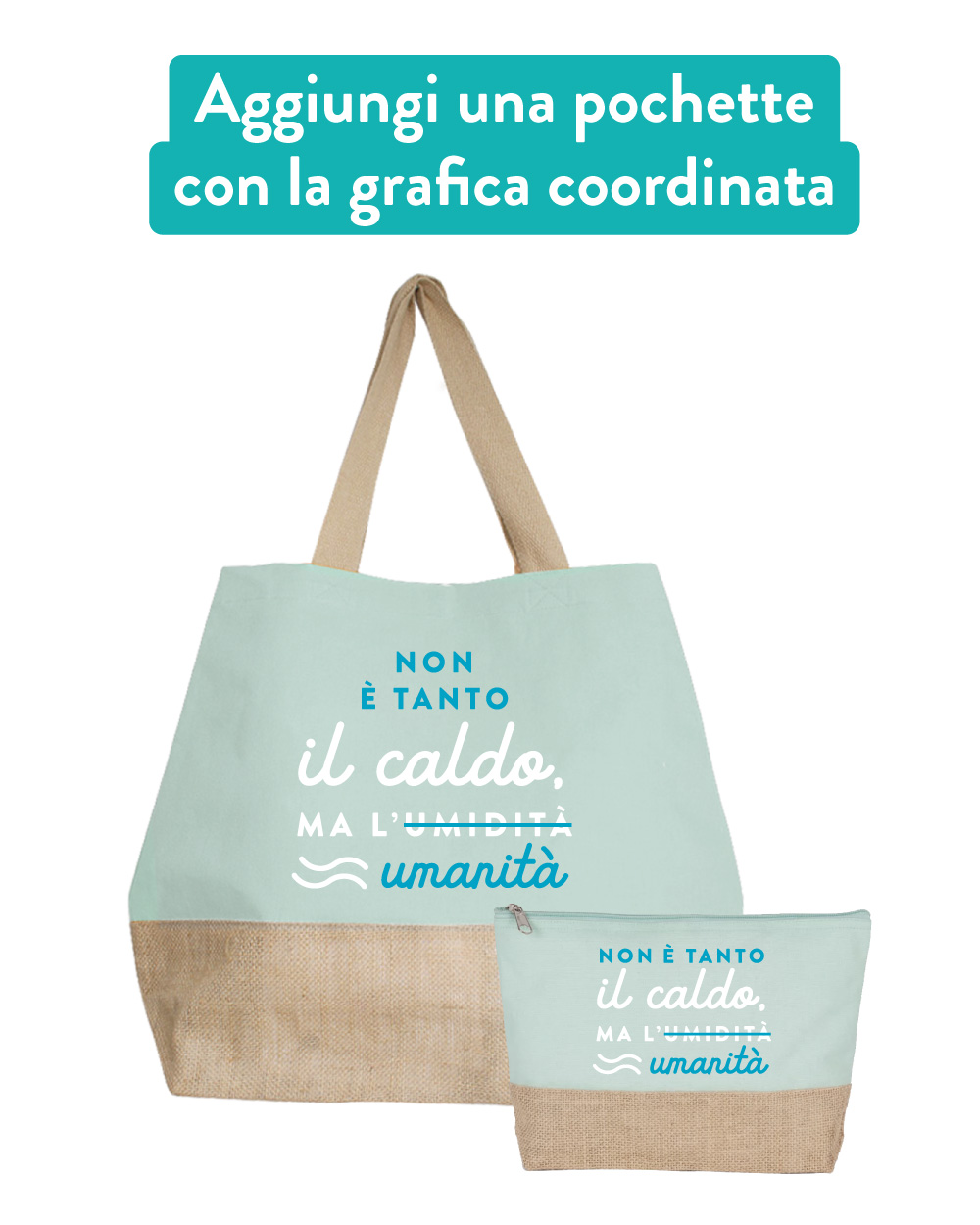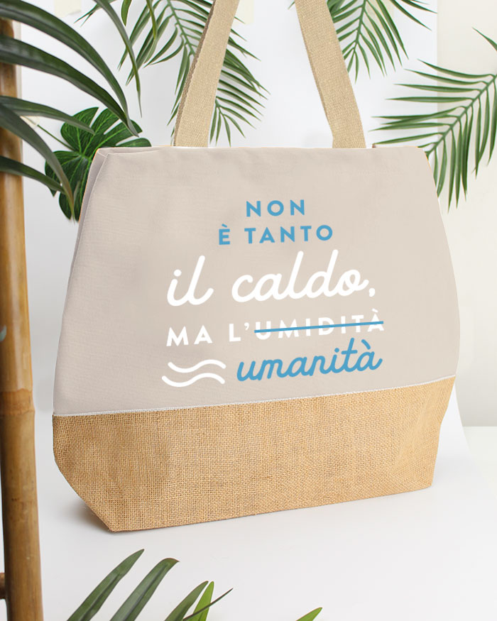 Simpaticissima borsa bicolor in juta e cotone con scritta “Non è tanto il caldo ma l’umanità”, una chicca che renderà ancora più cool il tuo outfit estivo. Perfetta come idea regalo ironica e divertente, non mancherà di stupire la vostra mamma, sorella o la vostra amica del cuore! La scritta non è modificabile.