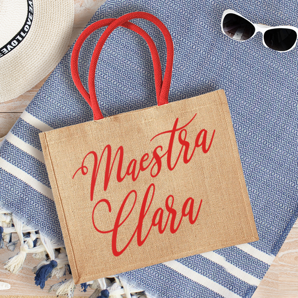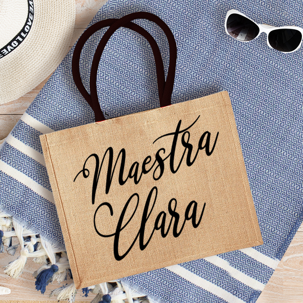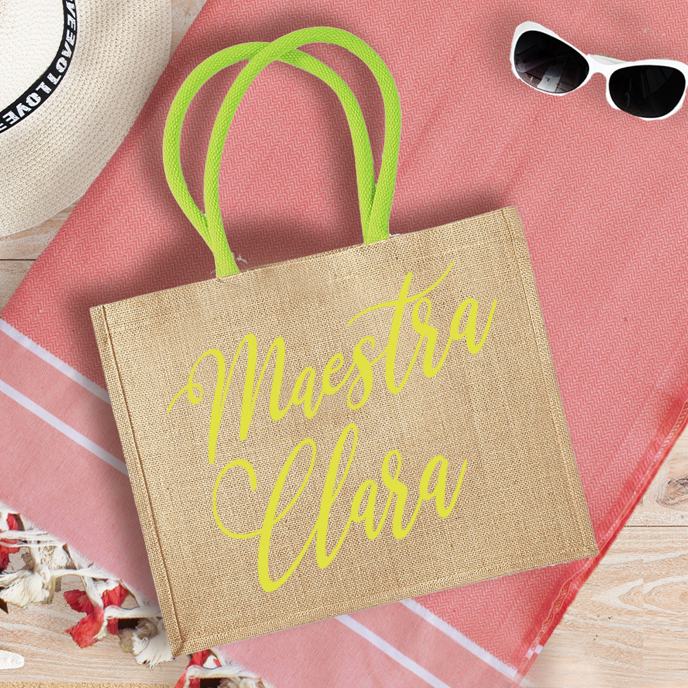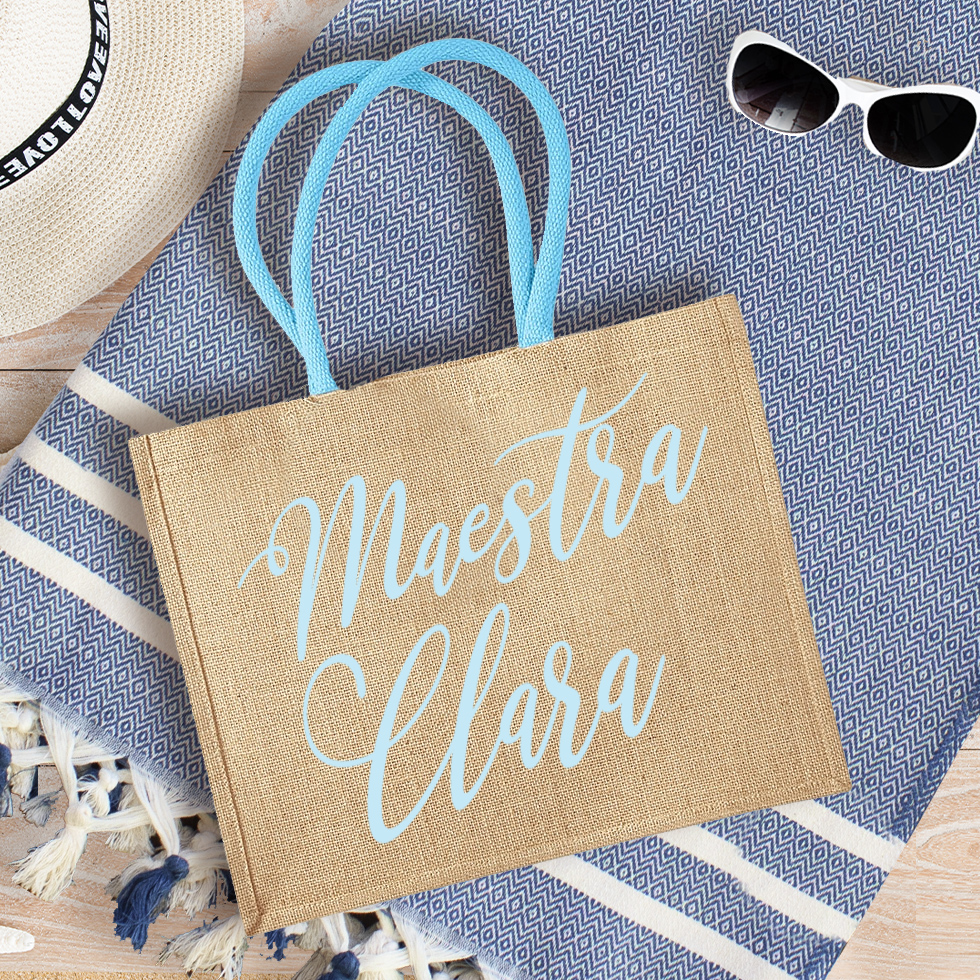 La tua maestra non vedrà l’ora di sfoggiare questa splendida borsa mare in juta personalizzata con il suo nome. Pratica e capiente, disponibile in 5 bellissimi colori, è perfetta per la spiaggia perché lascia filtrare la sabbia. Personalizzala con il nome della tua maestra e scegli se abbinare anche un meraviglioso telo fouta personalizzato!