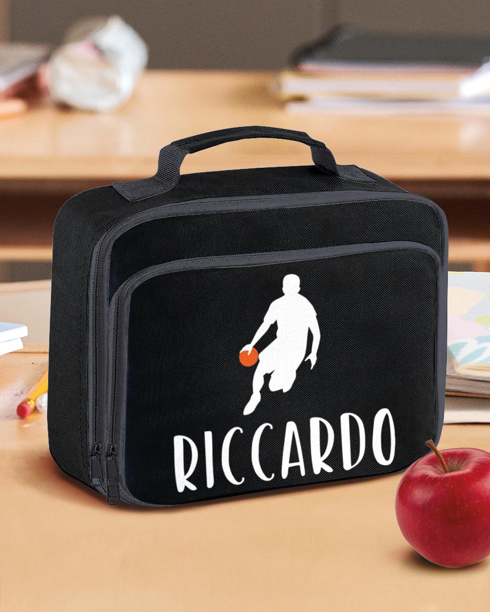 Hai un piccolo campione di basket che si prepara a tornare a scuola o all’asilo? La nostra borsa termica porta merenda personalizzata con nome e una vivace sagoma a tema basket è il regalo perfetto per lui! Non solo è una pratica borsa frigo, ma è anche un accessorio che accende la passione per il gioco e incoraggia la creatività.