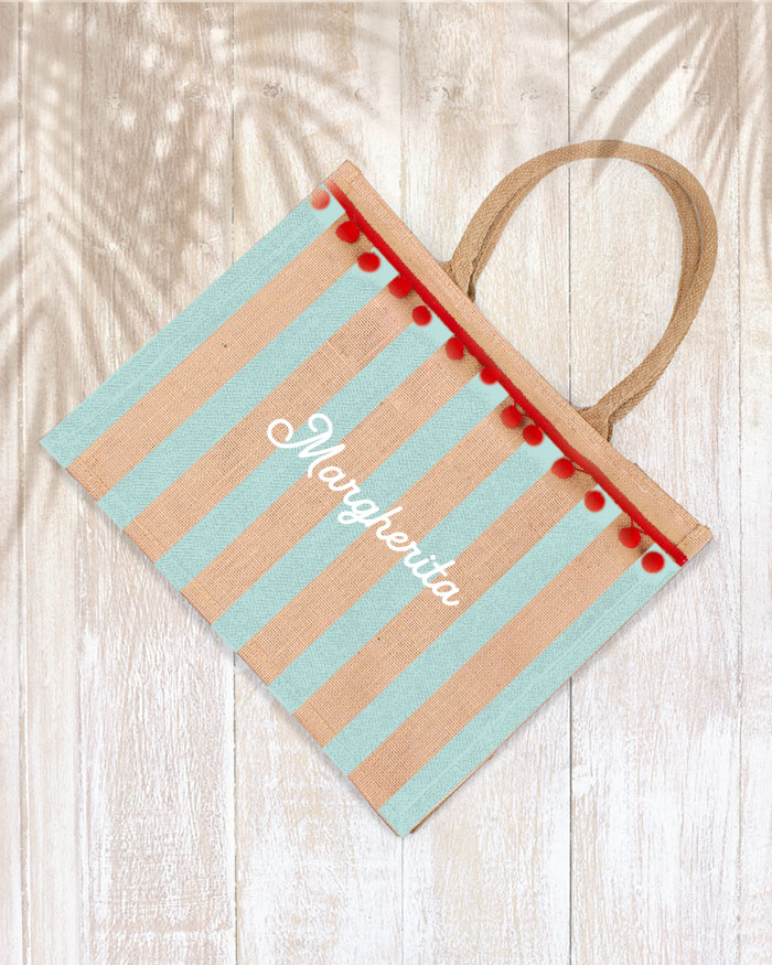 1 recensione per Borsa in Juta Personalizzabile con Pon Pon, Nome e Righe Azzurre – Idea Regalo Estate