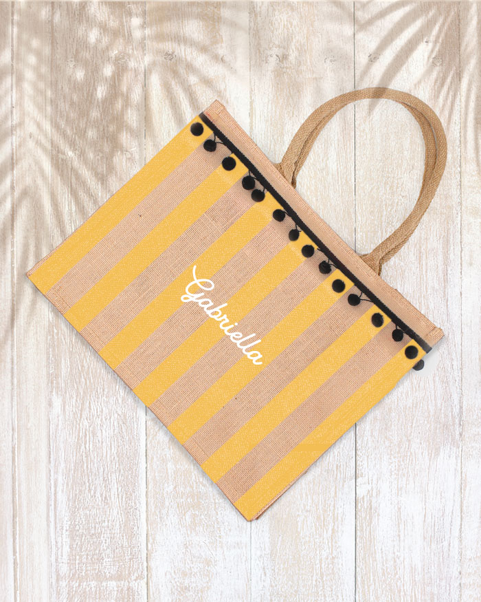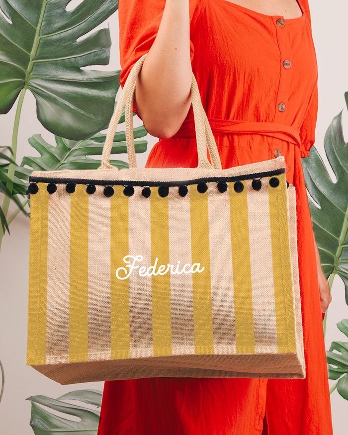 Borsa da mare in juta personalizzabile con nome, righe gialle e pon pon. Capiente e resistente, la fortunata destinataria di questo regalo non vedrà l’ora di sfoggiarlo in spiaggia!