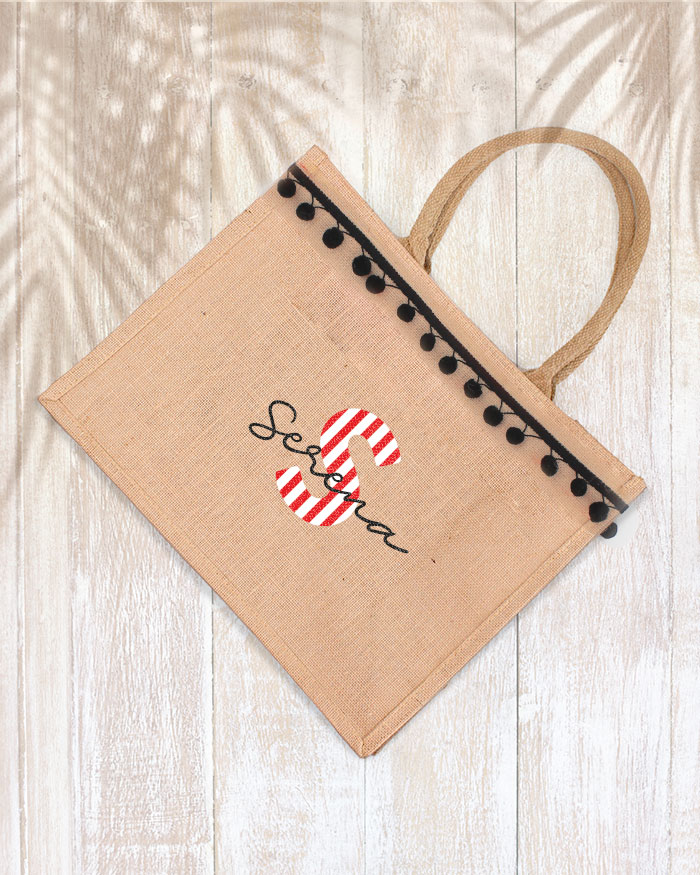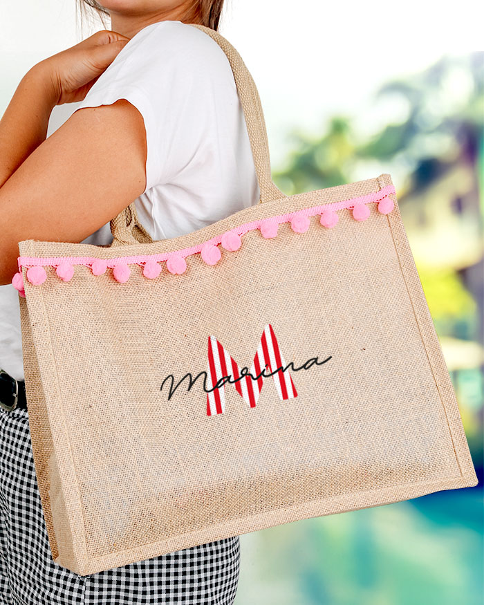 Simpaticissima borsa mare in juta personalizzabile con nome, iniziale e pon pon, perfetta per dare alla tua estate un look trendy e alla moda anche sotto l’ombrellone! Sarà eccezionale anche come idea regalo per la mamma o la vostra amica del cuore: rimarrà piacevolmente stupita!