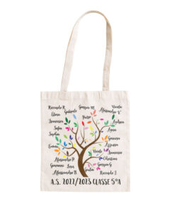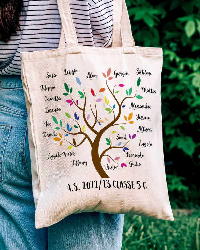 Meravigliosa Borsa Shopper per Regalo Maestre di Fine Anno decorata con un albero dalle foglie coloratissime circondate dal nome degli alunni.