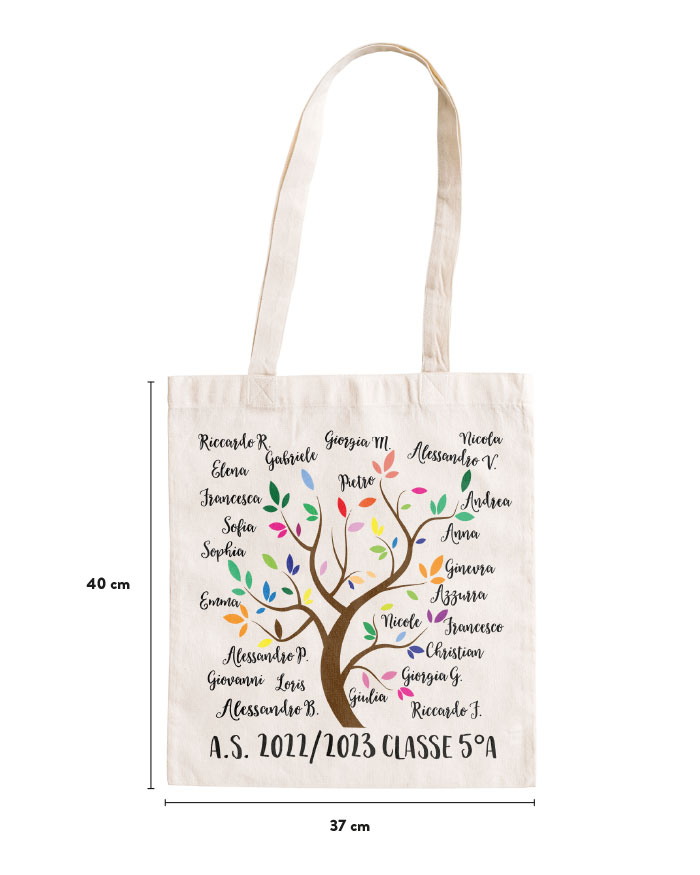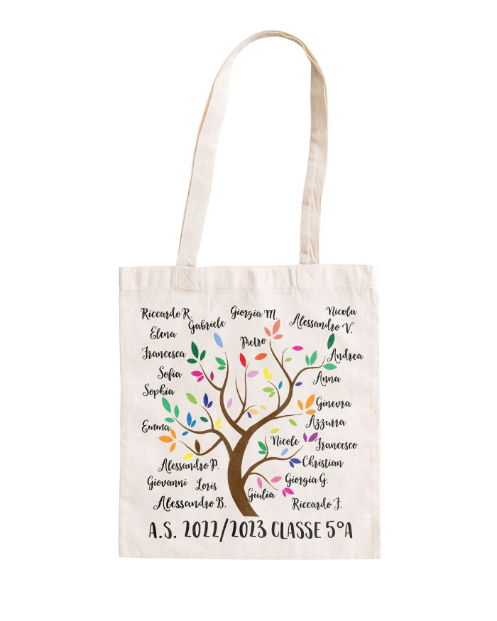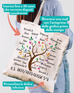 Questa borsa si personalizza con i nomi degli alunni che andranno ad essere scritti sui dorsi dei libri che la decorano. Sul fronte è ulteriormente personalizzata con il nome della maestra mentre sul retro potete aggiungere una dedica a piacimento.