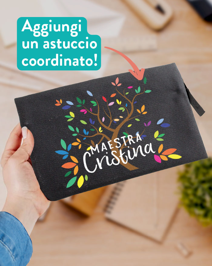 Se lo desideri, puoi completare il tuo regalo aggiungendo un astuccio in color nero che riporterà il nome della maestra desiderato e la grafica sarà coordinata a quella della borsa.