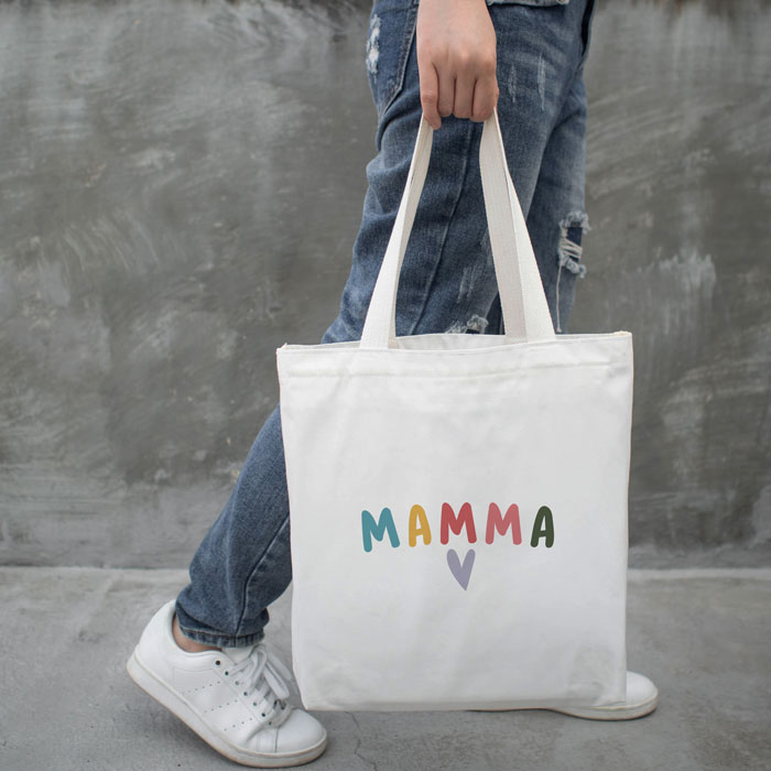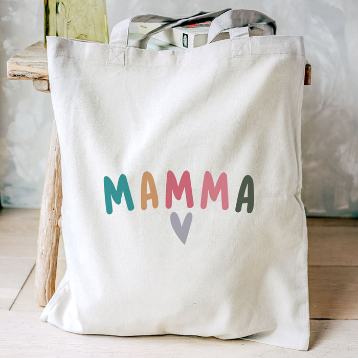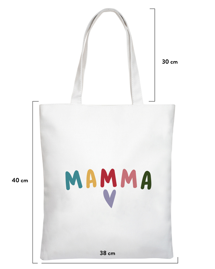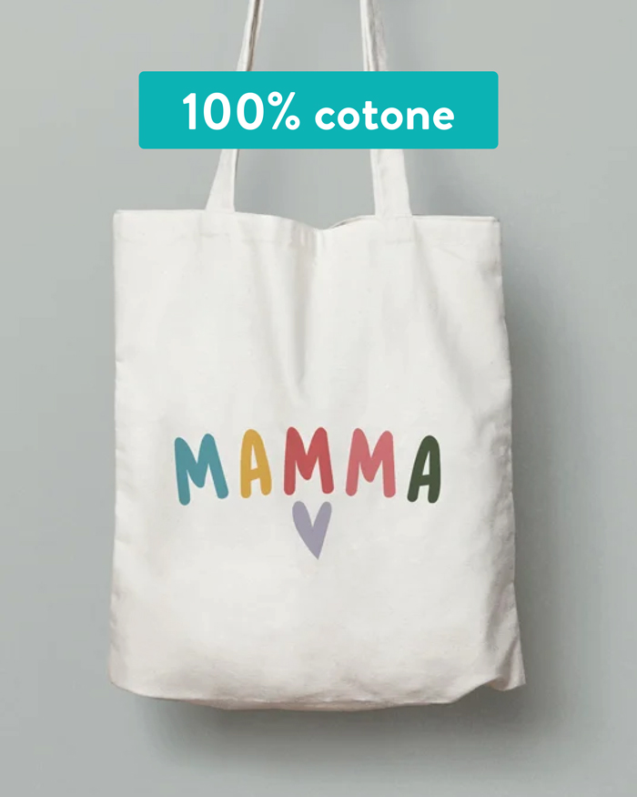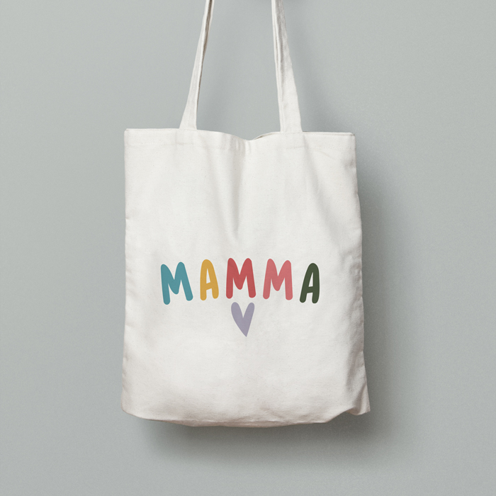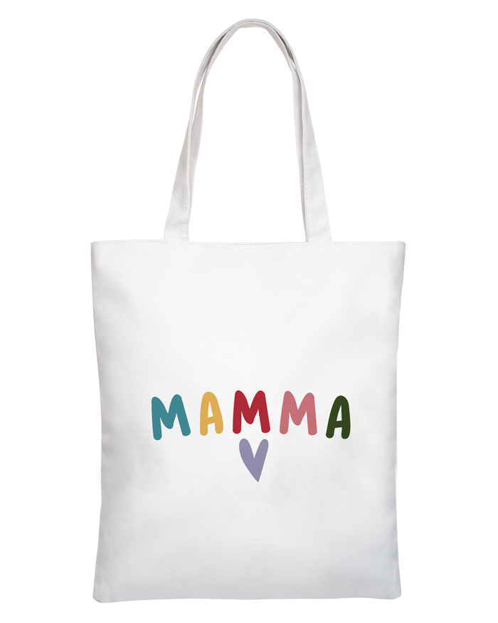 Borsa Shopper con scritta colorata “Mamma” e cuore, personalizzabile con dedica sul retro.
