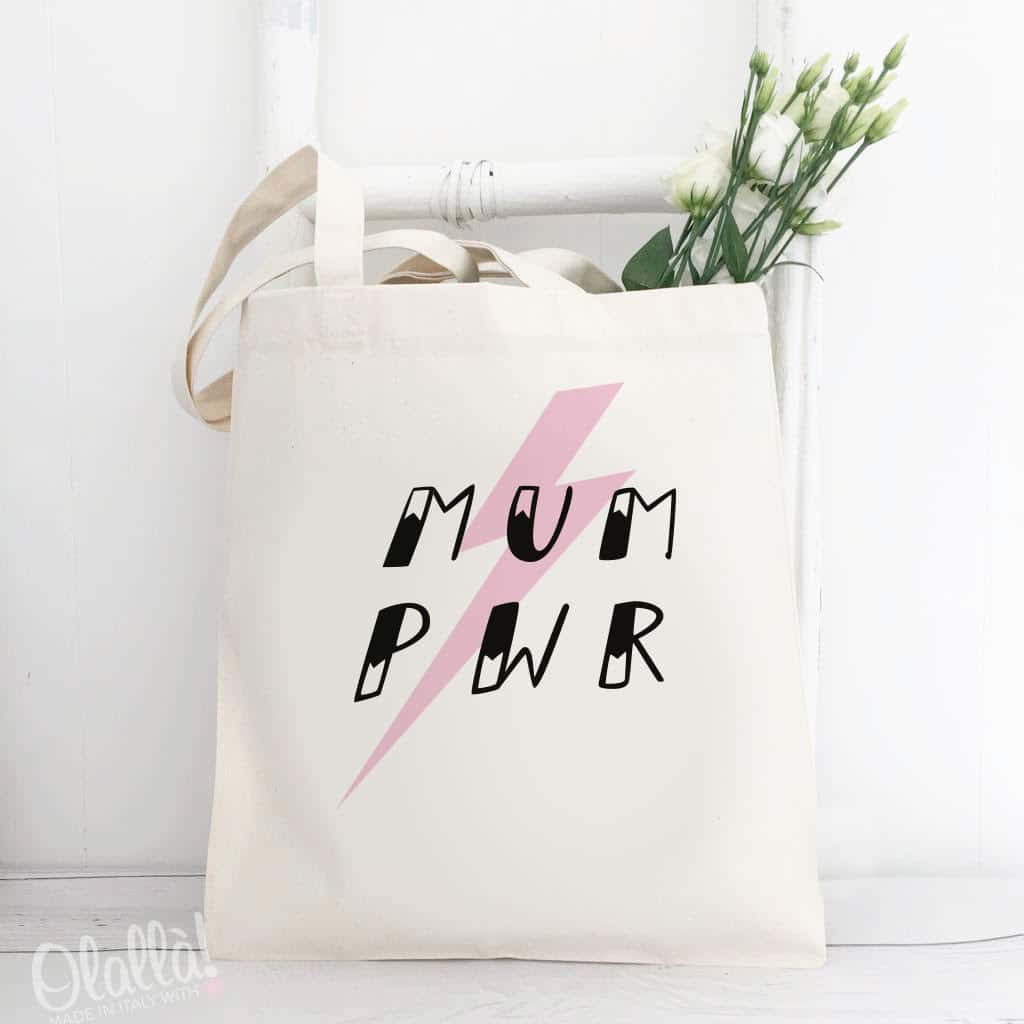 Meravigliosa borsa shopper con stampata la frase “Mum PWR” (Mum Power, il potere della mamma) e il disegno di un fulmine rosa. Una fantastica idea regalo per la vostra super mamma in occasione della Festa della Mamma o per il suo compleanno. Fatele sapere quanto è speciale e unica con questo regalo bello e molto utile!