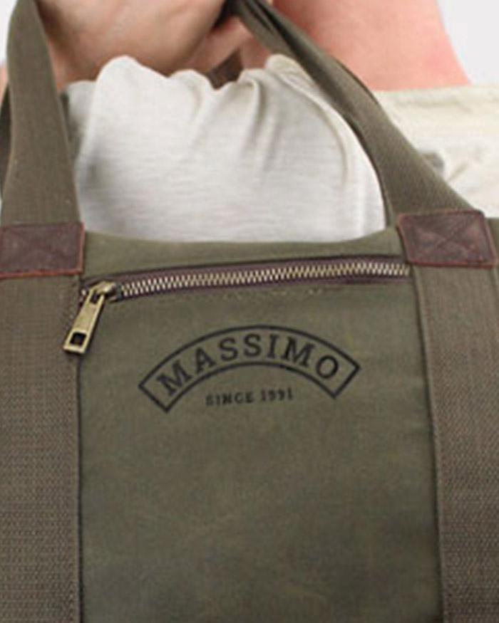 Materiali: 100% cotone, tela cerata in cotone, finiture in pelle, raccordi in ottone anticato, manici in tela di cotone. Interamente foderato, è presente una tasca interna. Lo scomparto principale extra lungo ha chiusura a zip per facilitare l’accesso al contenuto. La tracolla è regolabile e staccabile.