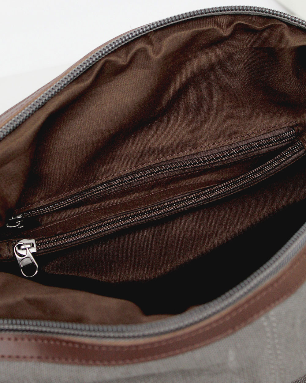 Borsone a mano in tela di canapa e finiture in cuoio, completamente foderato in tessuto e con tracolla rimovibile.