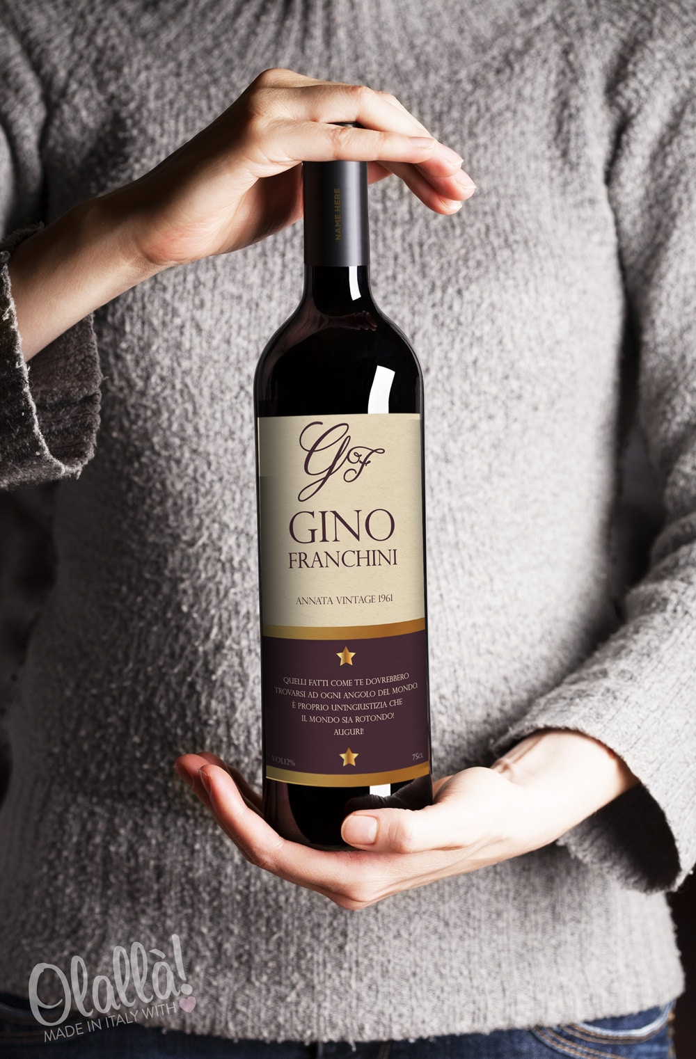 Queste bottiglie personalizzate sono un regalo perfetto per tutti gli amanti del bere bene, ed un complemento eccezionale per rendere ogni festa davvero unica! I nostri grafici sono sempre a vostra disposizione per creare etichette su misura per il vostro evento o occasione importante. Vuoi fare un grande ordine? Contattaci per maggiori informazioni a servizioclienti@olalla.it per conoscere i nostri sconti sui grandi acquisti.
