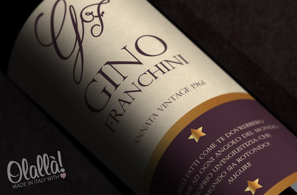 Personalizza la tua bottiglia compilando quanto ti viene richiesto nei campi del menù prima di aggiungerla al carrello. L’etichetta personalizzata viene stampata su carta di alta qualità.