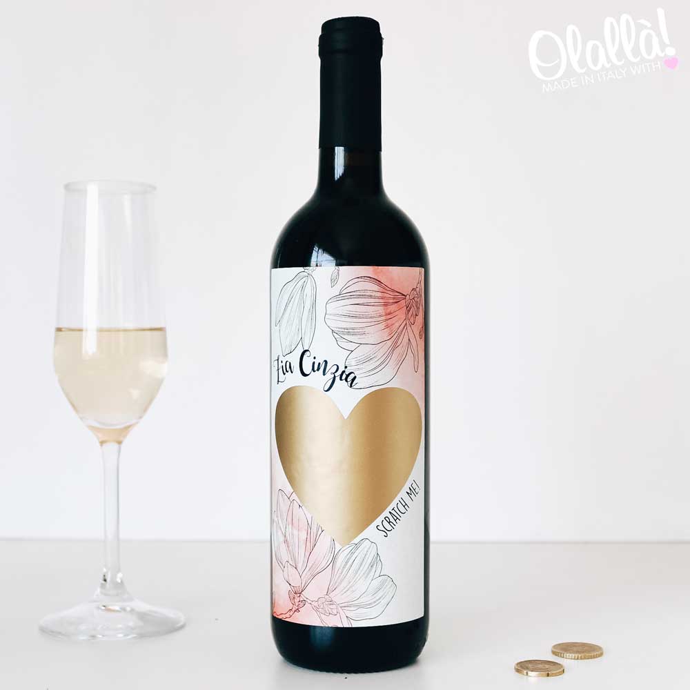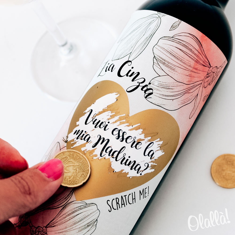 Originalissima bottiglia di vino o spumante personalizzata con cuore “gratta e vinci” che nasconde la tua frase segreta. Invita il destinatario a grattare il cuore, l’emozione e lo stupore sono assicurati! Un modo unico per chiedere a chi riceverà la bottiglia di essere la madrina al Battesimo del tuo piccolino, ma personalizzabile anche per tantissime altre occasioni.